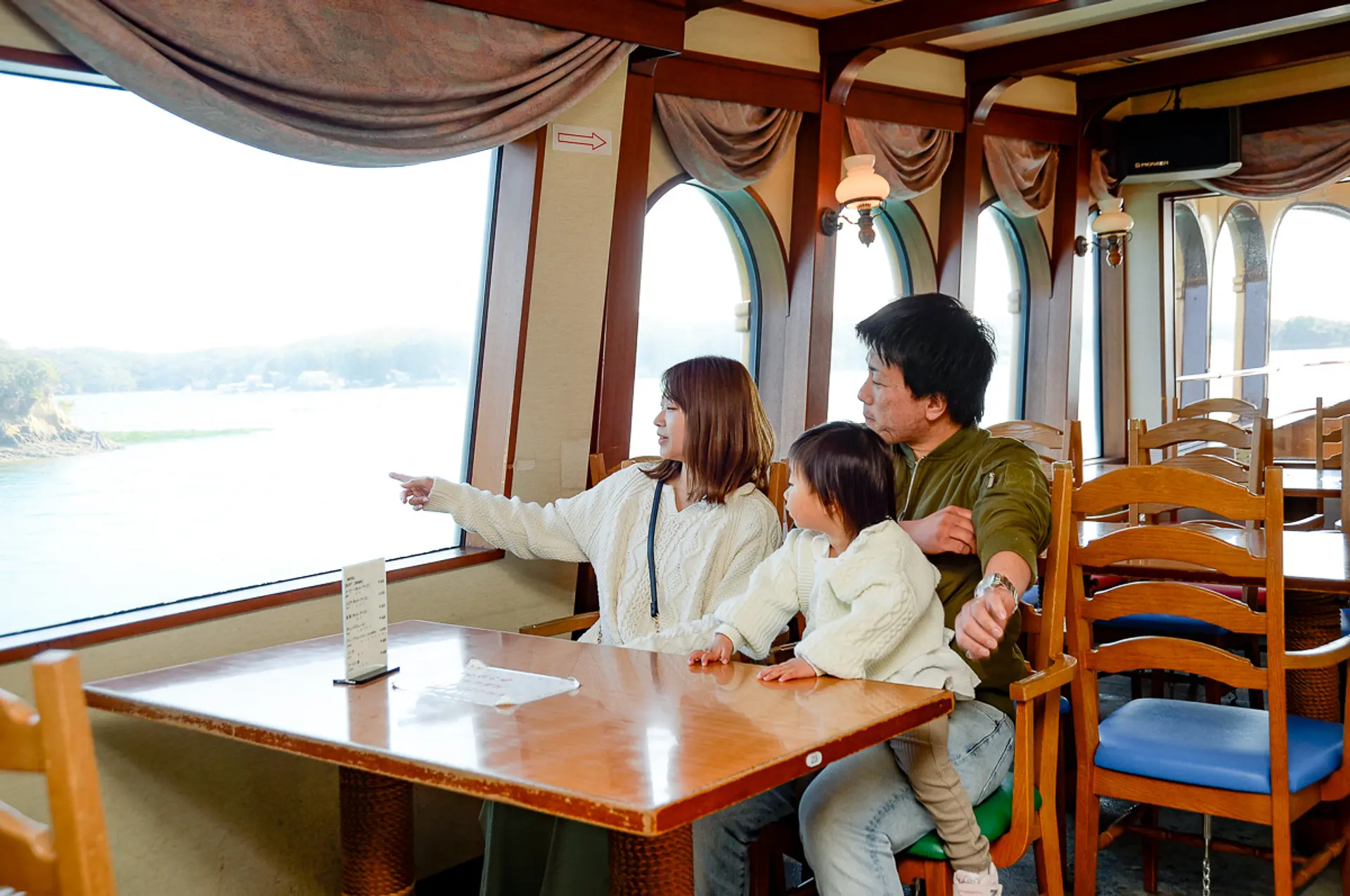 船内には景色を案内するアナウンスが流れ、志摩の自然や産業についても学べますよ。