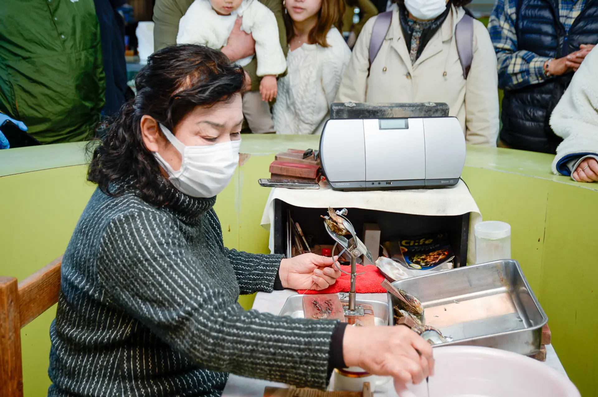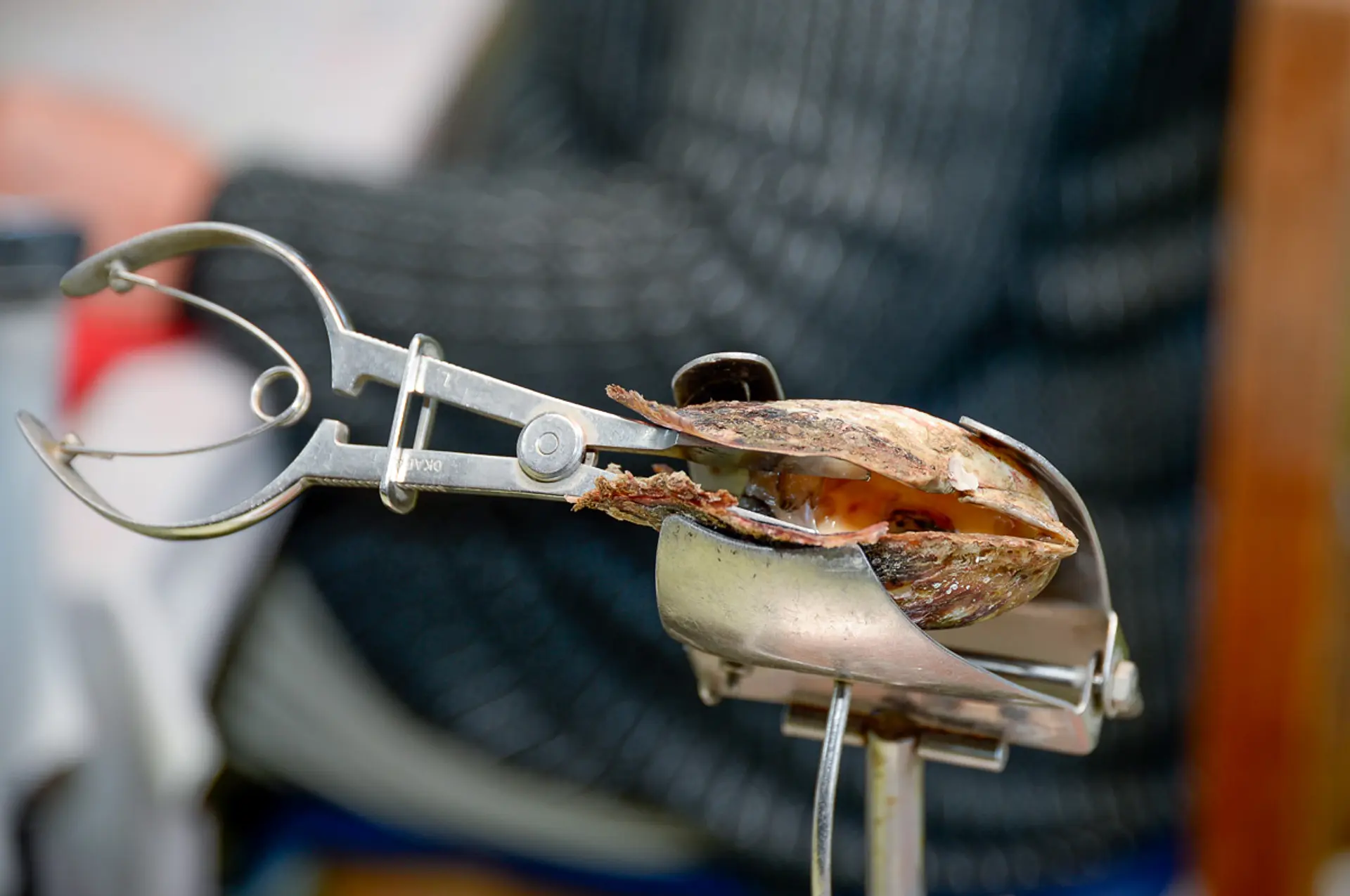ここでは、養殖真珠の核入れ作業の実演を間近で見学することができます!