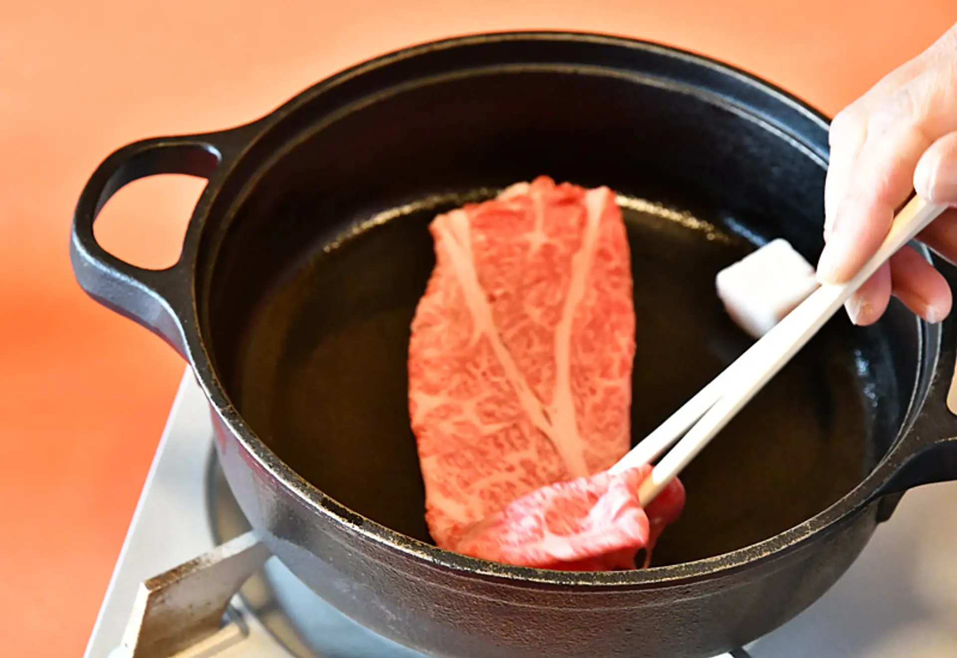 まず、火をかけ温まった鍋に牛脂をまんべんなく広げ、そしてお肉を一枚とって焼きます。