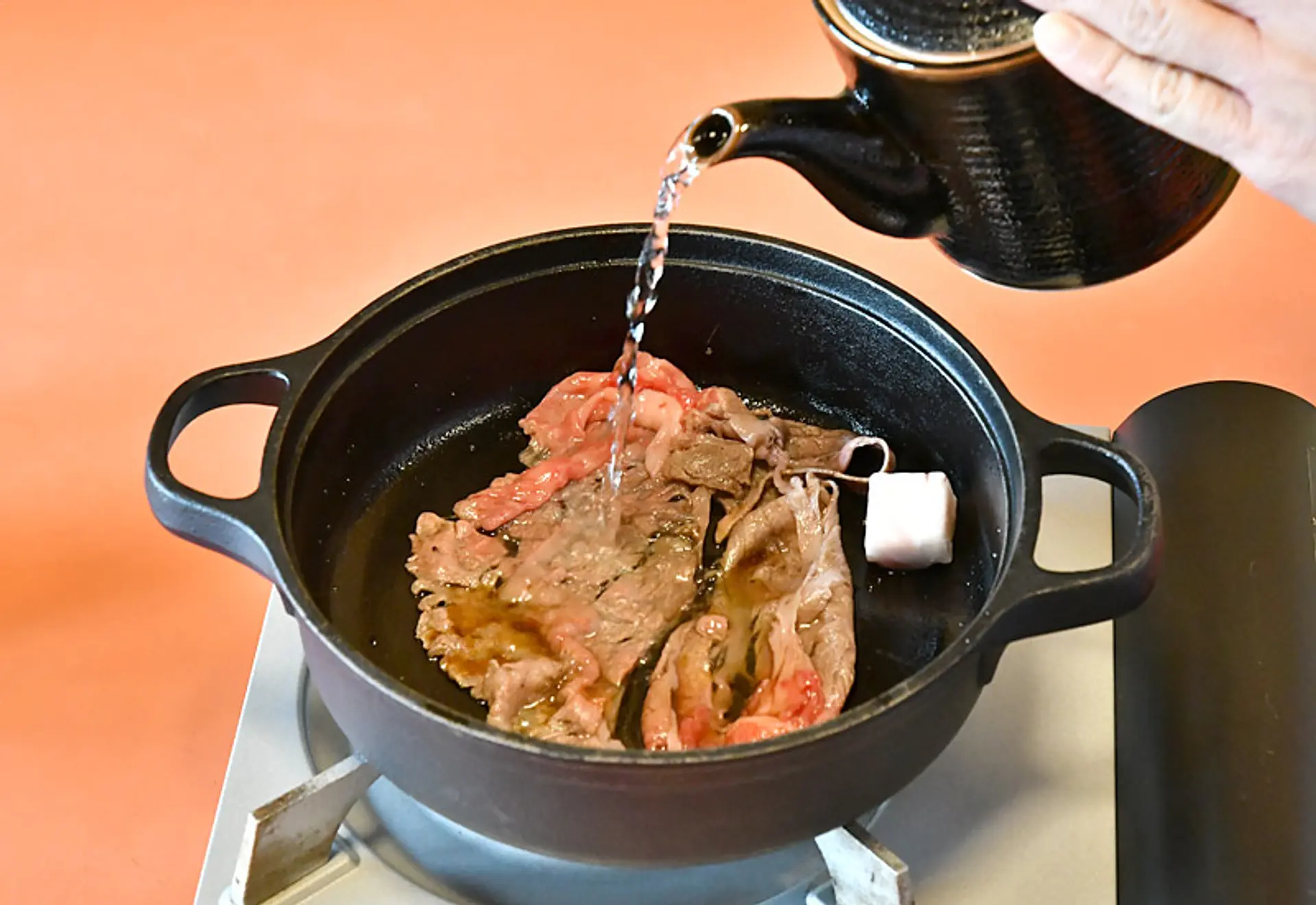 お肉がある程度焼きあがってきたら、きび砂糖、醤油、そしてまるよしオリジナルの出汁を加え味を整えてゆきます。