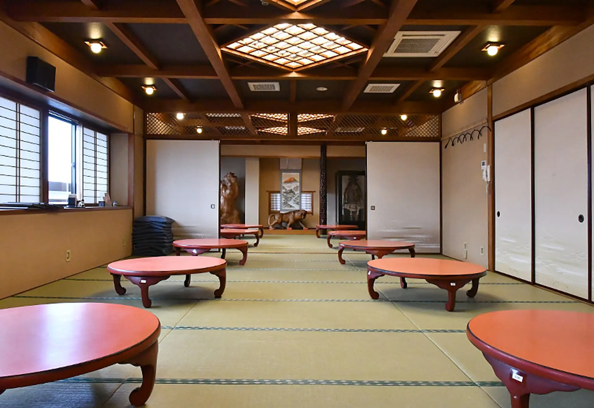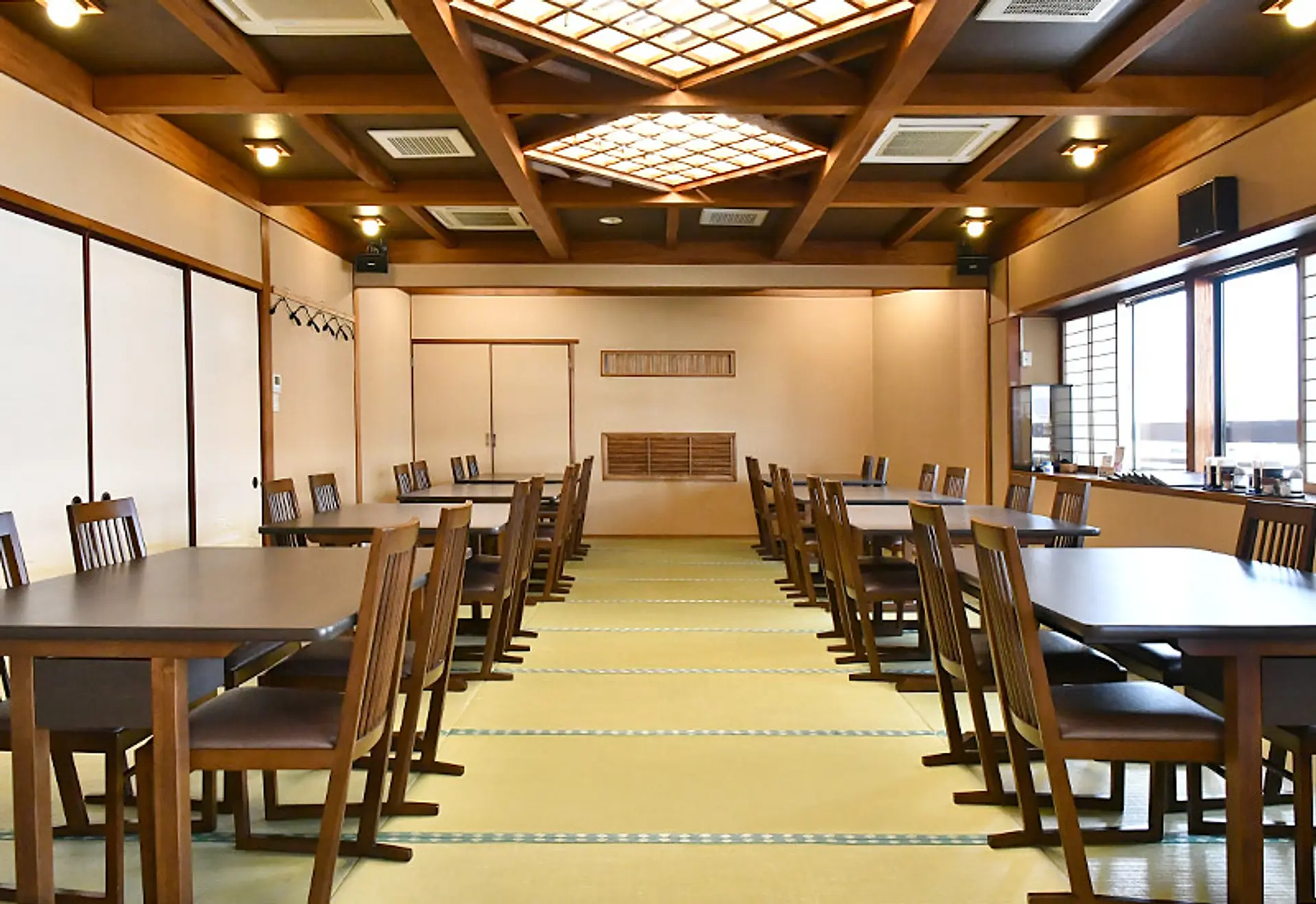団体の方でたたみの上にそのまま座るのは苦手な方向けの大広間です。靴を脱いで畳の上の椅子に座り、落ち着いてゆっくり食事が楽しめそうですね。
