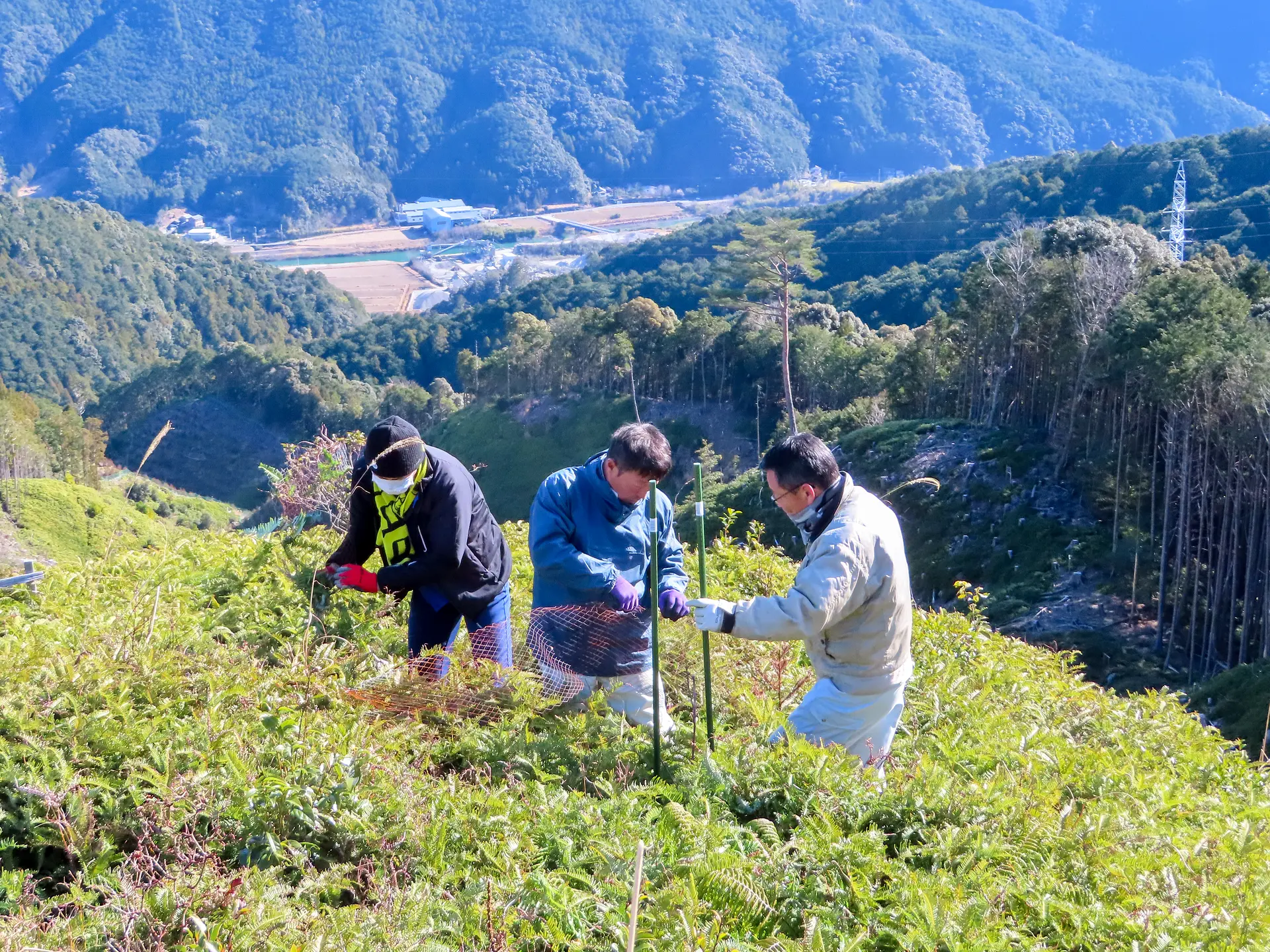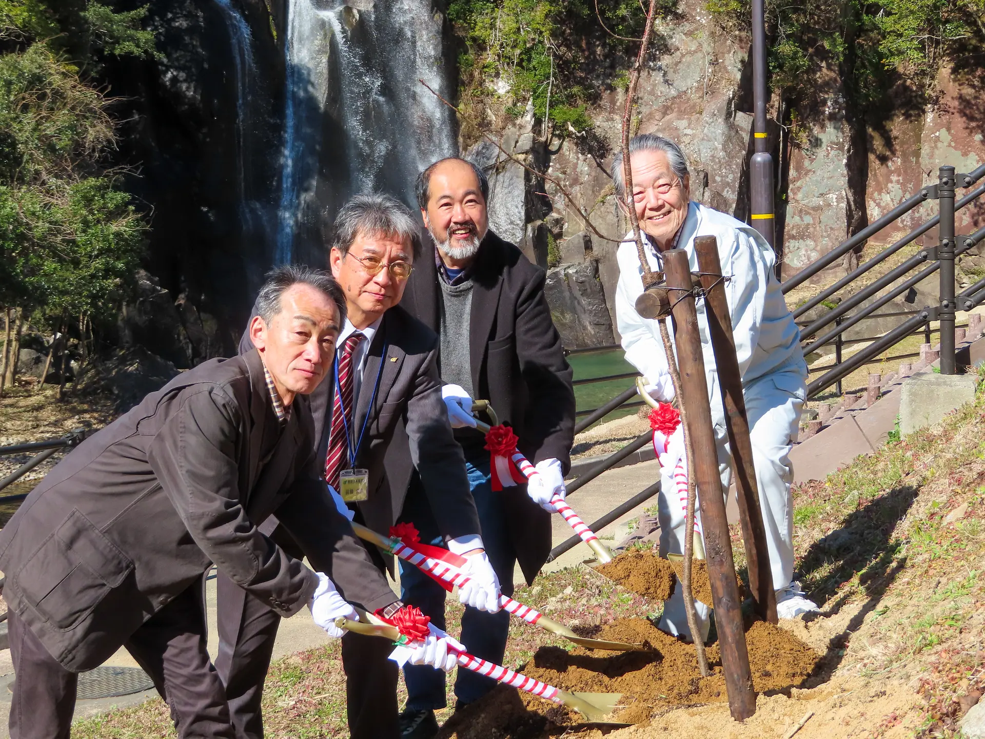 写真は2020年2月に飛雪の滝キャンプ場で実施されたクマノザクラ植樹の様子。写真の右から2番目の人物が、クマノザクラ発見者の森林総合研究所 多摩森林科学園の勝木俊雄農学博士(以下、勝木先生)です。