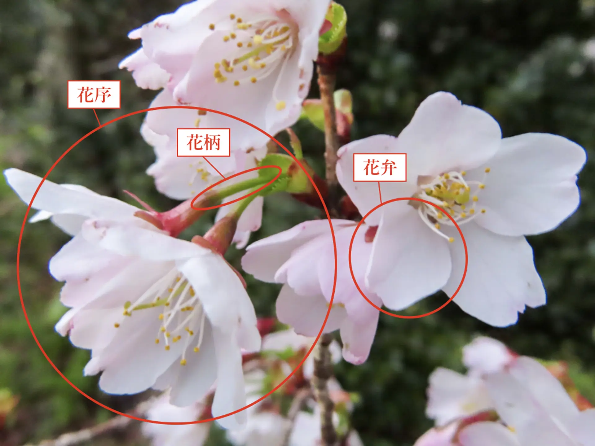 ・花弁(かべん)/花びら:白〜淡いピンク色、先端がやや濃い色のものもあります。