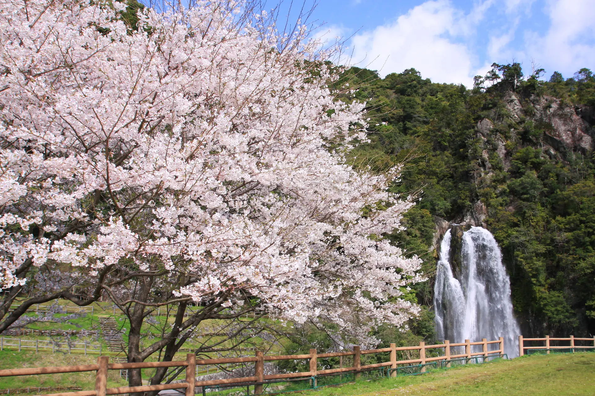 御船島を一望できる場所から飛雪の滝キャンプ場方面へ約40mのところに目印看板があります。ここから、さくら山までは車で5km(約15分)です。
