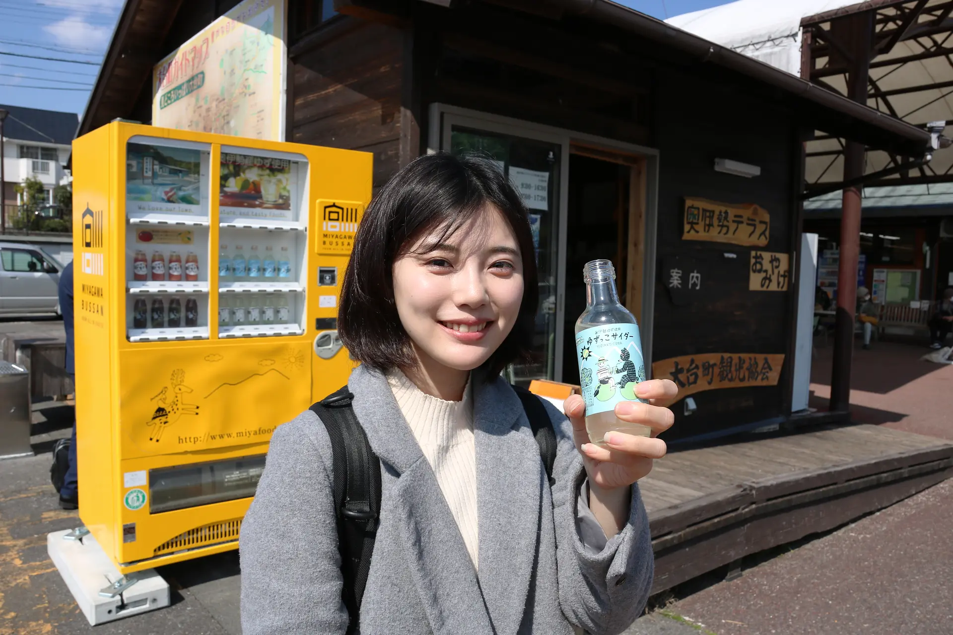 テラス横に設置された「ゆずっこ自販機」で、宮川物産の奥伊勢ゆずドリンクも購入しました。自販機をバックにいただくのが大台町の旅の始まり王道プランなんだとか。