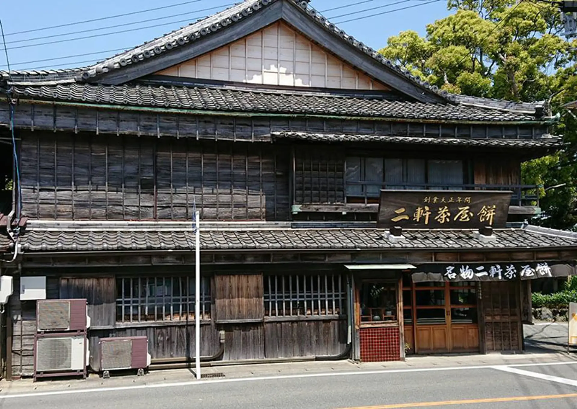 天正3 年(1575 年)伊勢神宮への長旅で疲れた旅人をもてなし迎える茶屋として餅を作り、味噌・醤油を作り、440 余年の永きにわたり二軒茶屋餅として代々受け継がれてきた『角屋』。