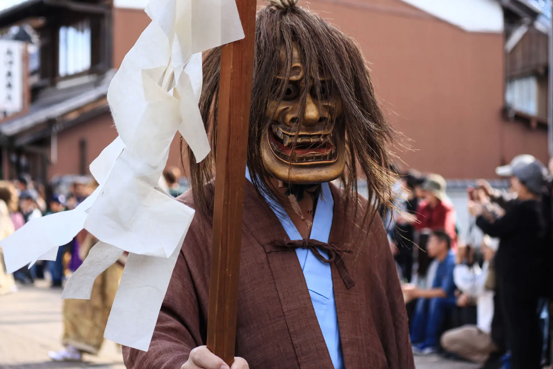 町で観衆に襲いかかるようにひょろつくと、その恐ろしくもユーモラスな仕草は、大人を笑わせ子どもを泣かせます。