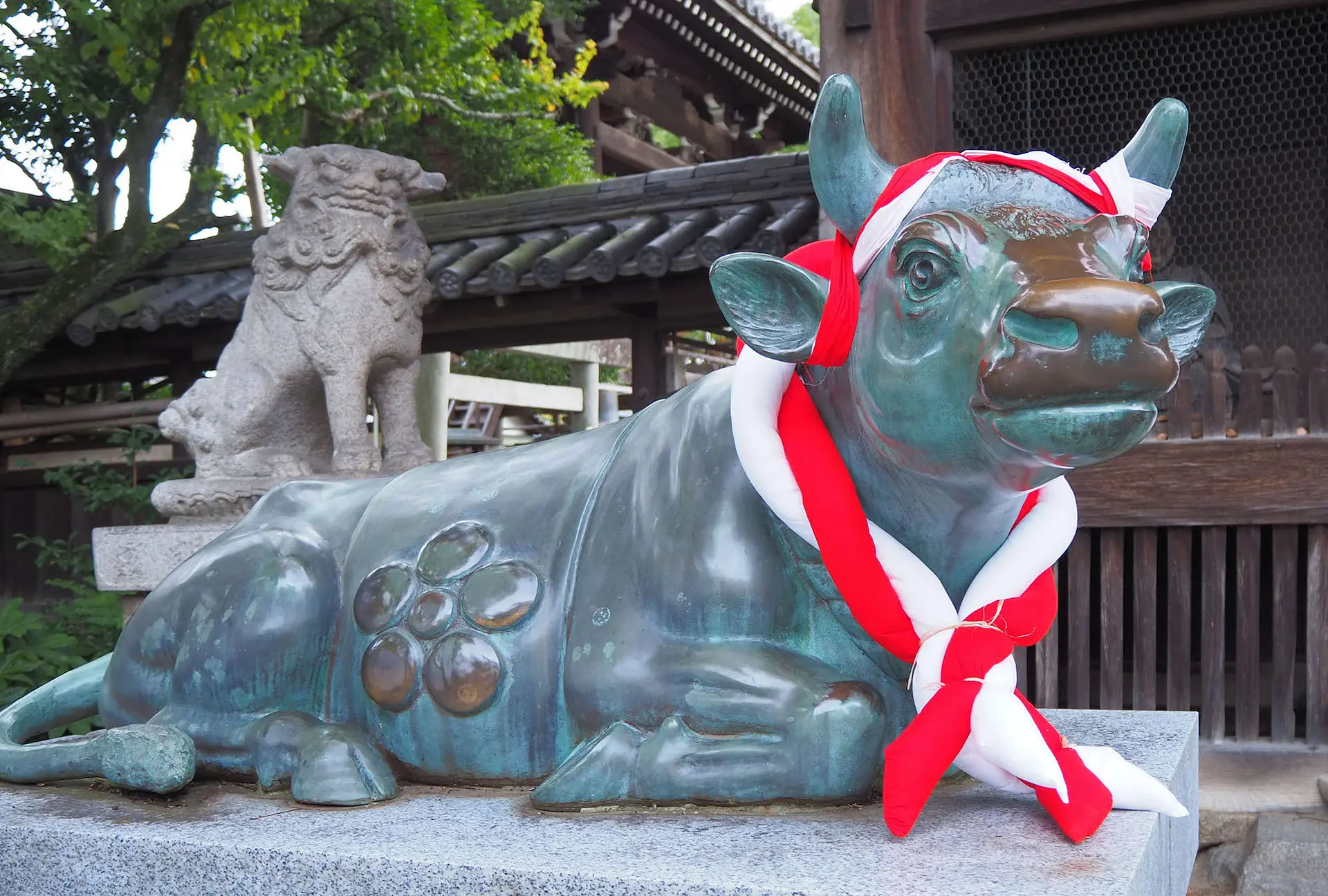 古くからこの牛の座像を撫でると頭が良くなり、病気や怪我を癒してくれると信じられています。