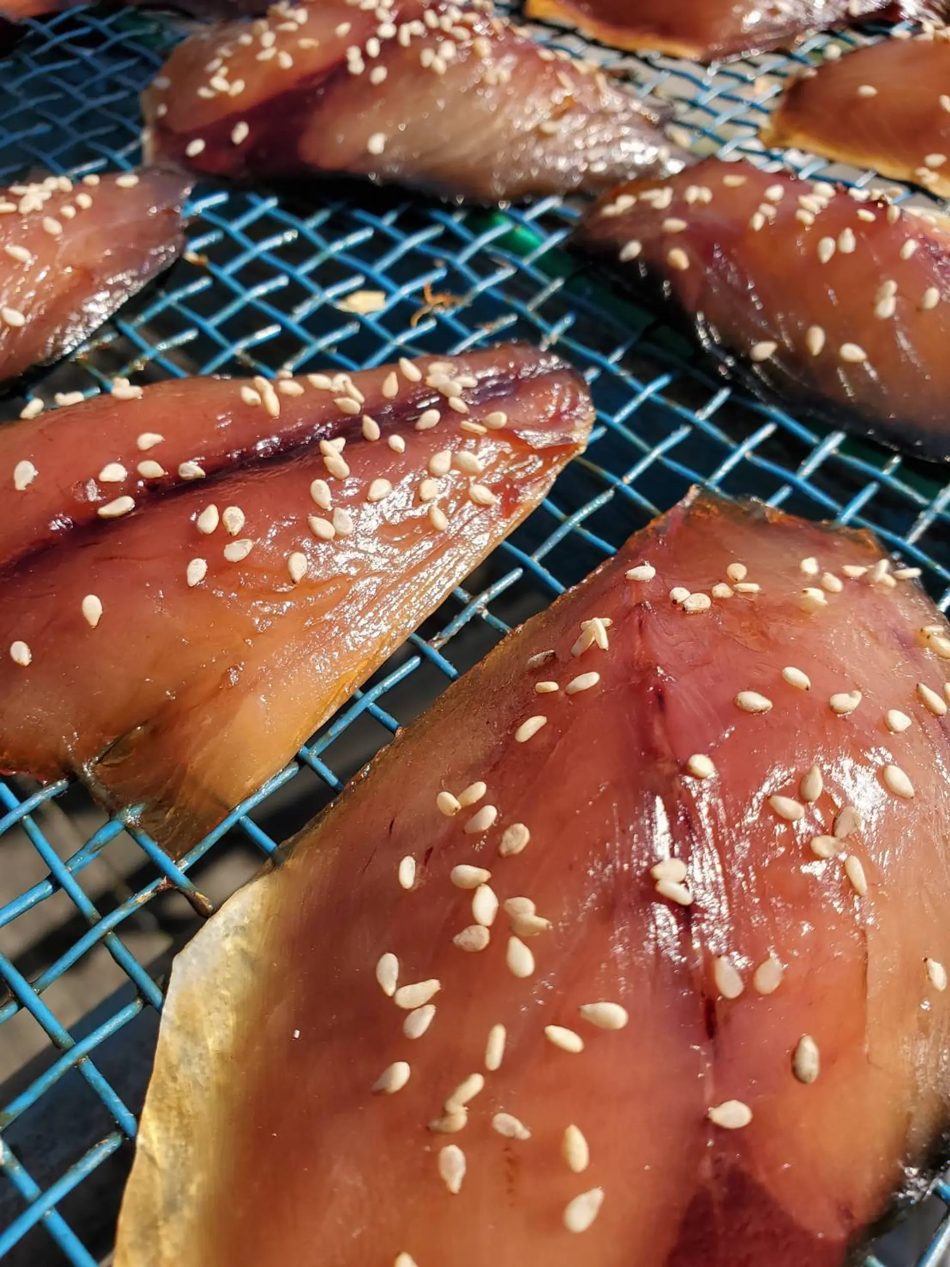 漁港のすぐ近くにある干物店。仕入れた魚を、手作業で一枚ずつ開き、特製だれをつけた「みりん干し」、塩を浸透させる「塩干し」、塩をつけない「素干し」などを販売。天然の「天日干し干物」は魚本来の旨みが引き出され、特に「サバの桜干し」は冷めてもふっくらやわらかい自慢の一品。