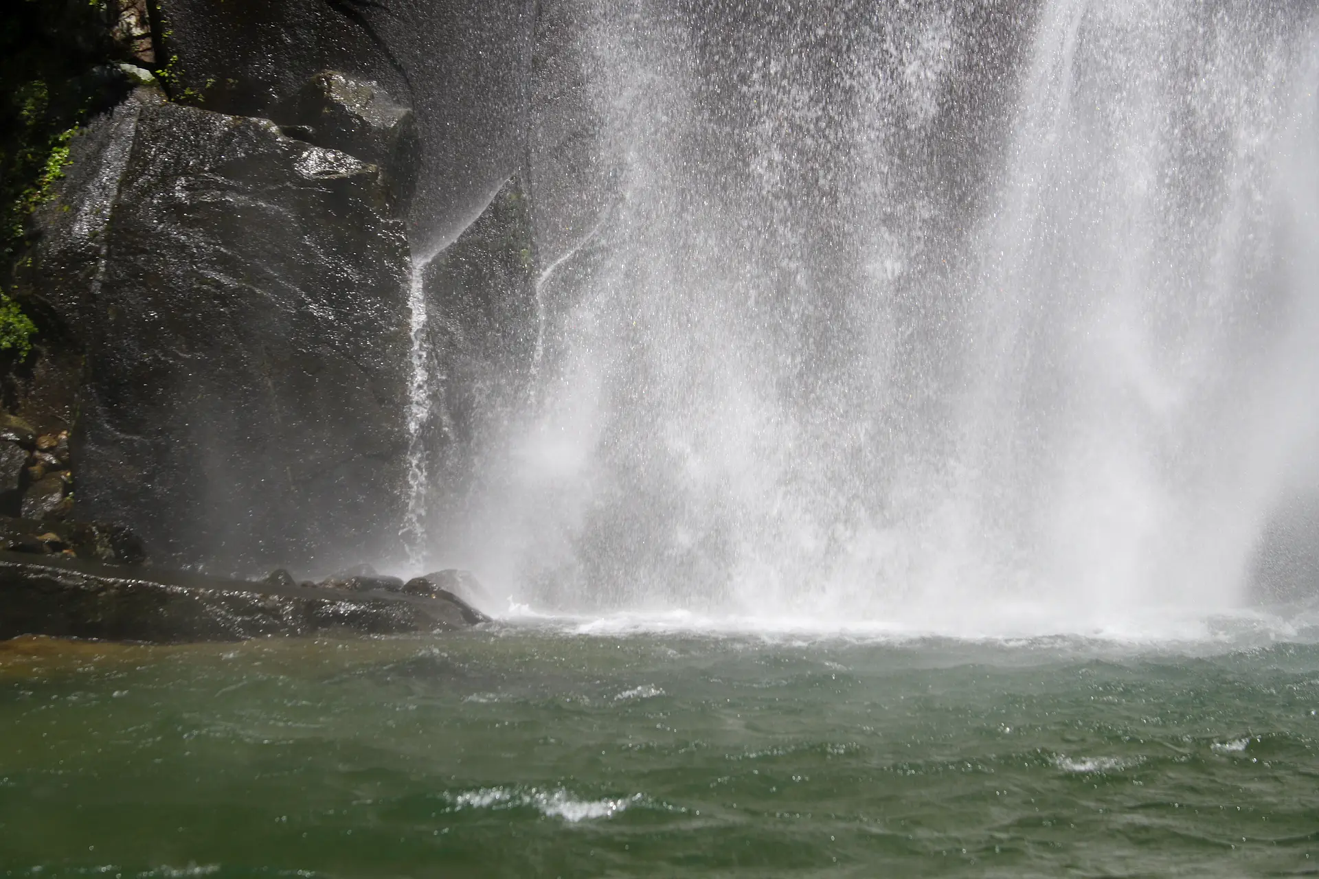 夢中でこぎ続けると、滝壺の岩壁に手を触れられる場所に辿りつきました。パドル操作をしなくても、とどまっていられる場所、そこは滝の裏にある「滝壺ポケット(はまじ命名)」でした。