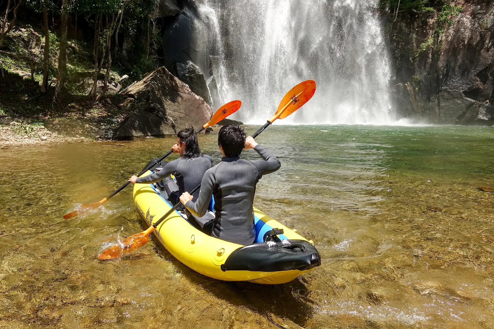 と5分程度のパドル練習後、僕らは滝へのファーストトライを敢行しました。ウェットスーツを着ているので水の冷たさはまったく問題なし。