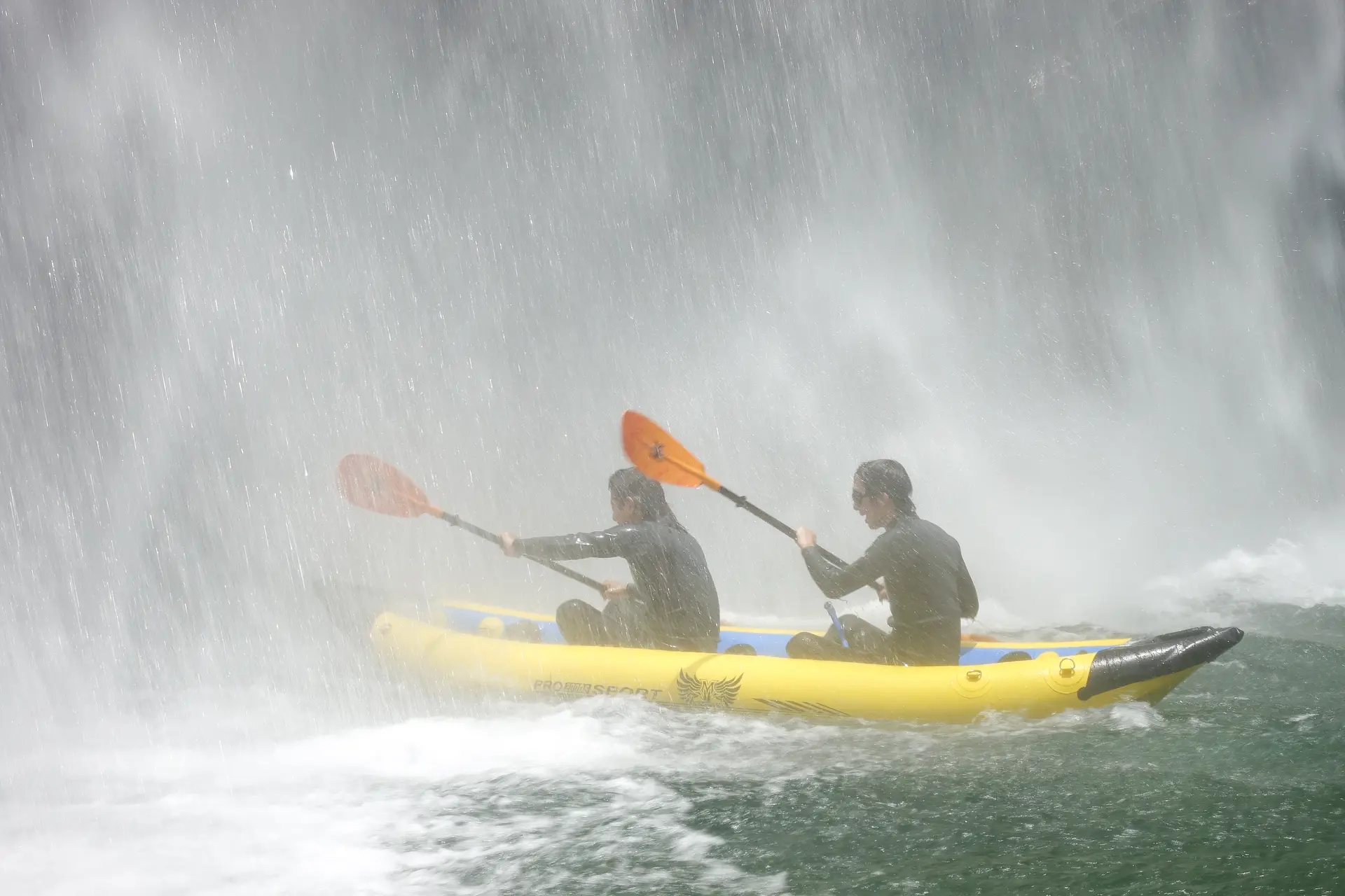 しかし、近づくほどに強くなる滝からの風、そして降り注ぐスコールのような滝水に気持ちを乱され、息の合っていたパドル操作もバラバラに。そして、ここで問題が発生します。