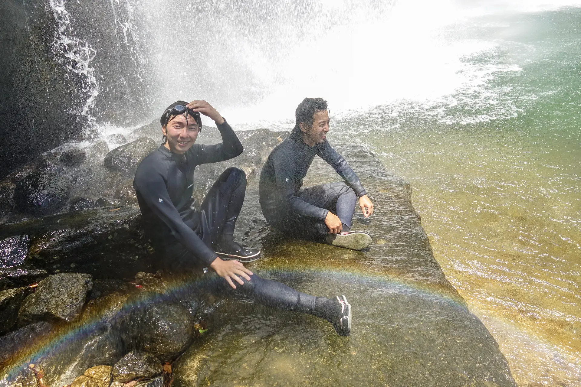飛雪の滝では、天気が良ければ虹にも出会えます。まるで、僕らの滝ダッキー生還を虹が祝福してくれているようです。
