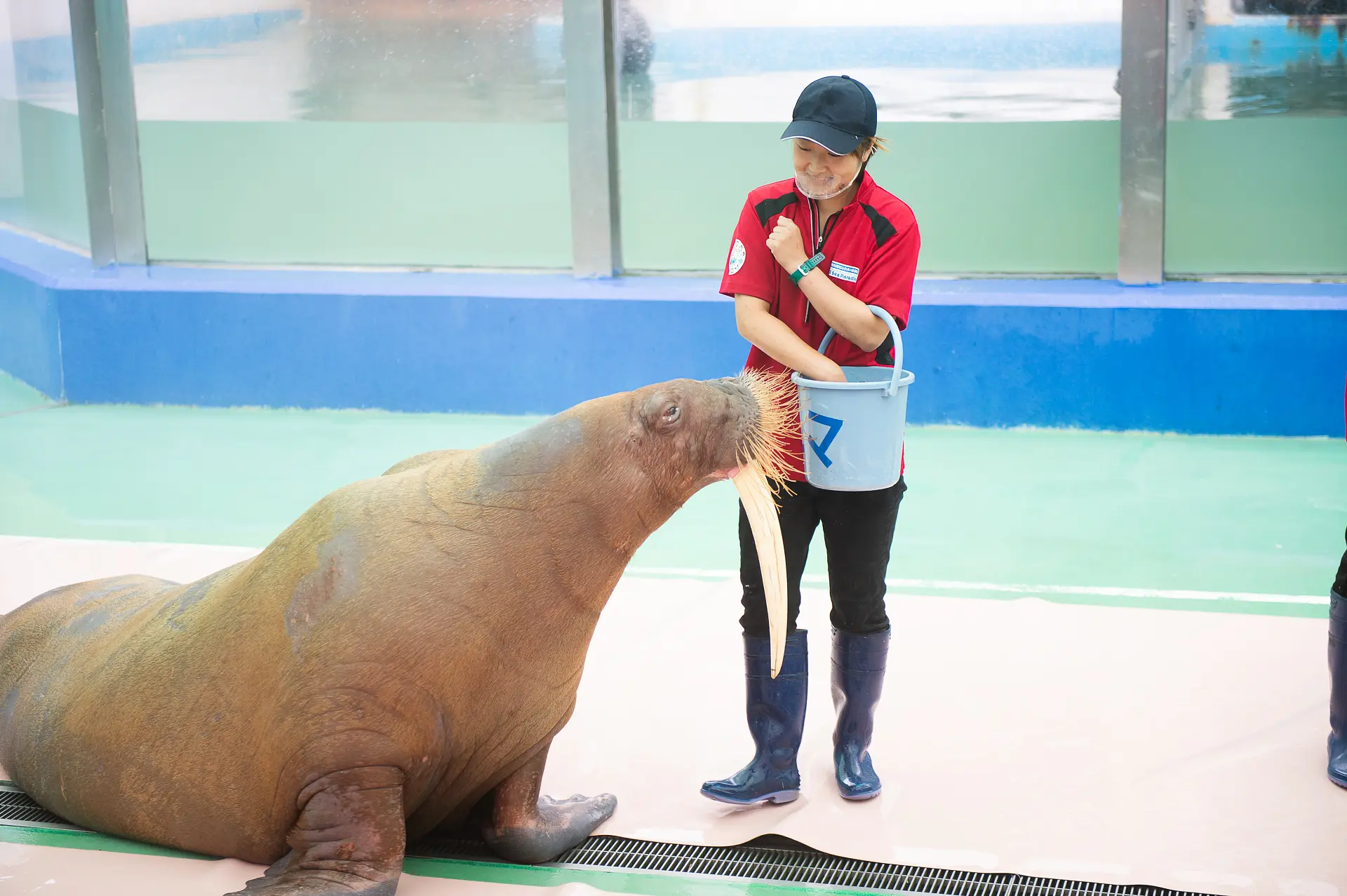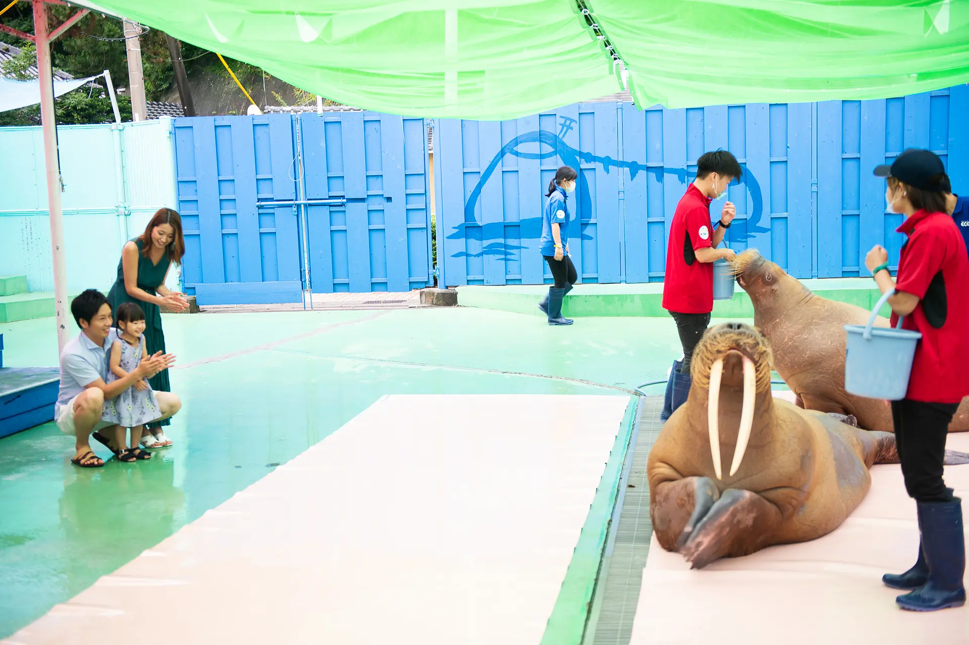 音楽とともにセイウチたちが水槽の外へやってきました!間近で見るとその大きさに圧巻!挨拶やあくび、拍手などさまざまな芸を飼育員さんとの見事なコンビネーションで楽しませてくれました。