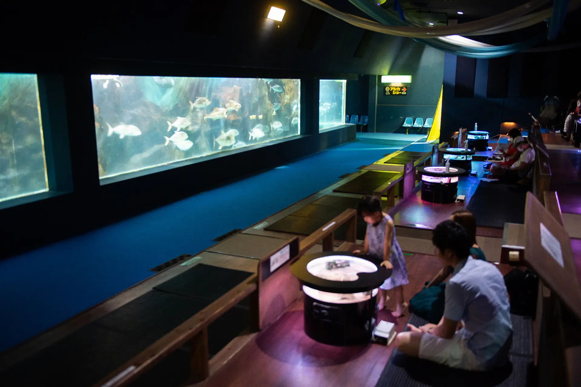 その名の通り、靴を脱いでごろごろ転がったり、ソファに座りながら休憩できます。館内で一番大きな水槽の回遊水槽を見ながら、まるで海底にいる気分♪大回遊水槽には、大きなアジが悠々と泳いでいますよ〜!