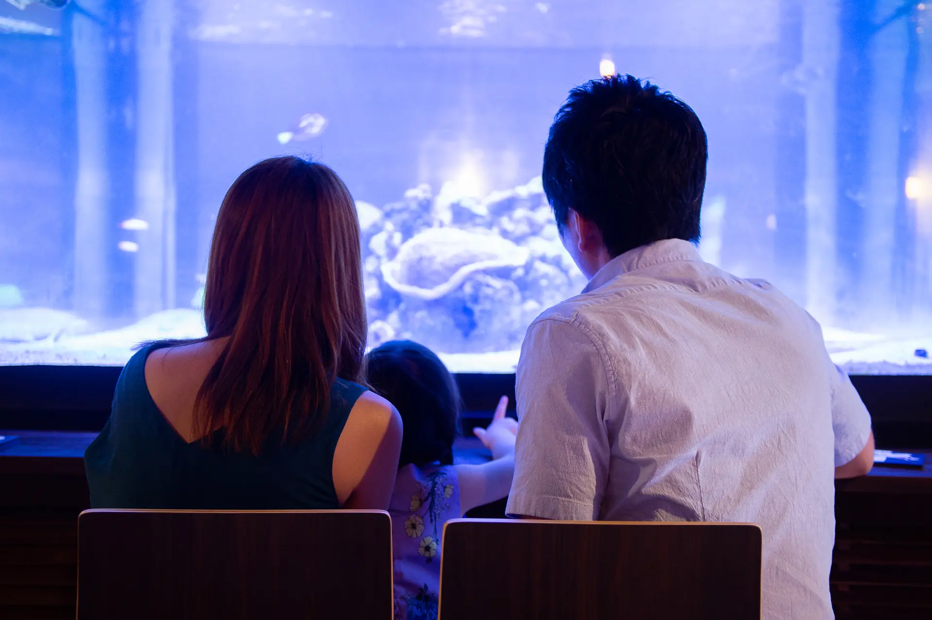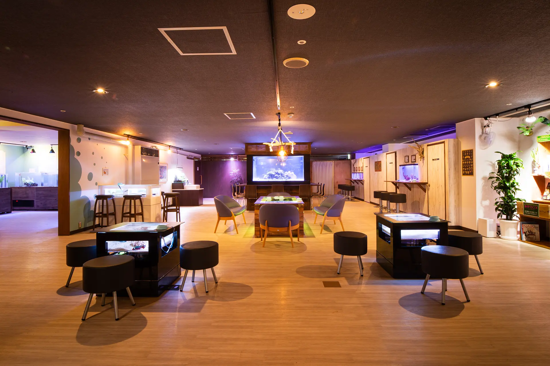 水槽の前に座ってゆっくりお魚たちを観察できる、今までになかったおしゃれなアクアリウムカフェエリア。お茶やコーヒー持ち込んで、水槽の前に座りゆっくりできます。(飲み物のみ持ち込みOK・エリア内に自動販売機あり)