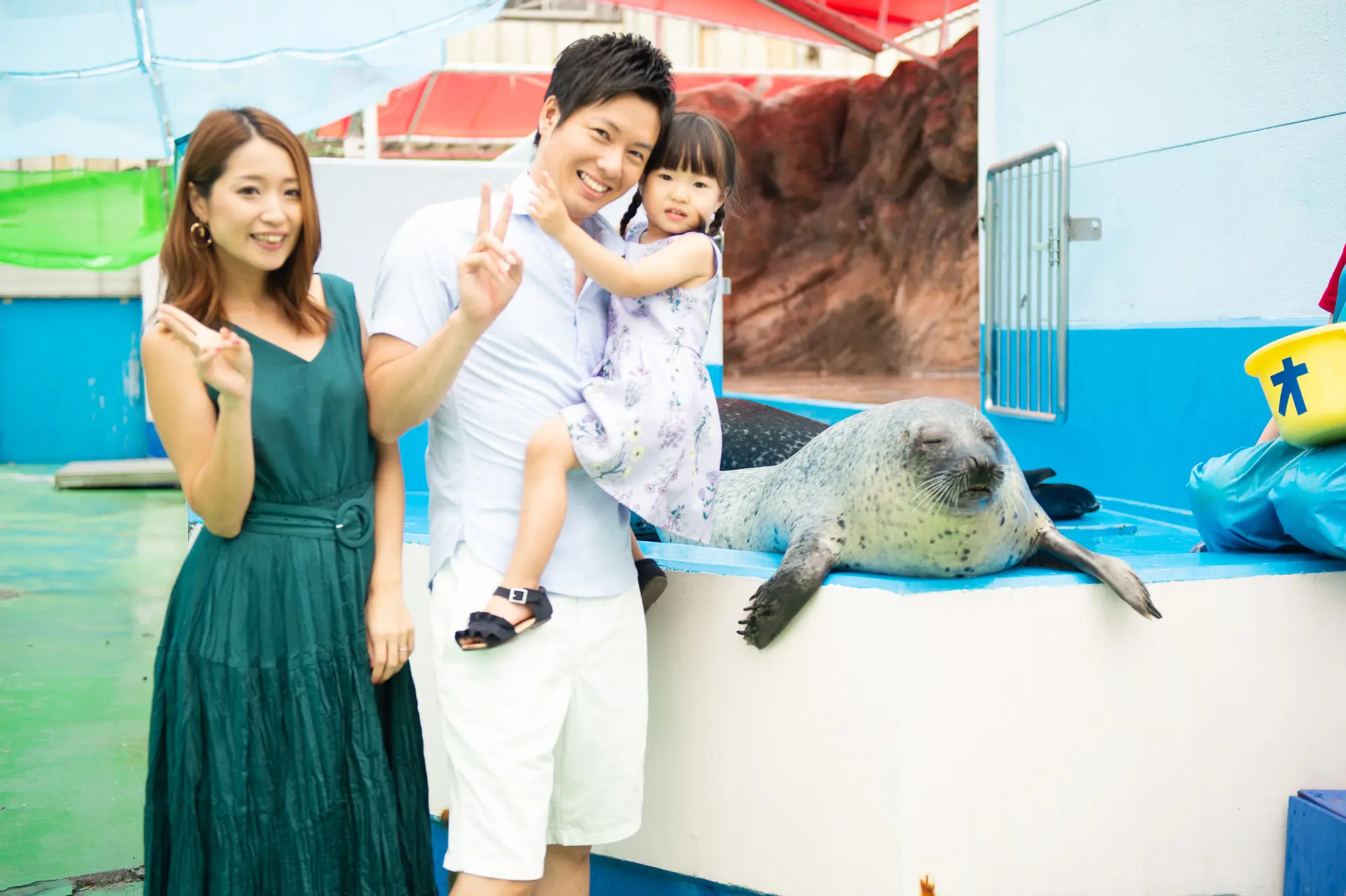続いて、「ゴマちゃん」ことゴマフアザラシと記念撮影。指定の時間になると、かわいいゴマフアザラシと写真を撮れます。(時間は事前に公式ホームページでチェックしておきましょう)