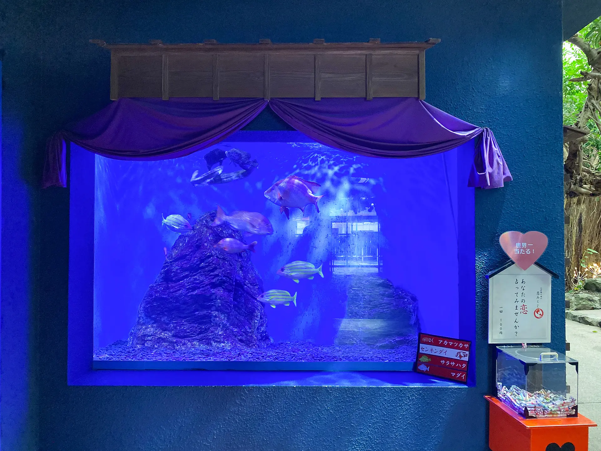 夫婦岩オブジェのまわりを紅白の魚たちが泳ぐ「夫婦岩水槽」や