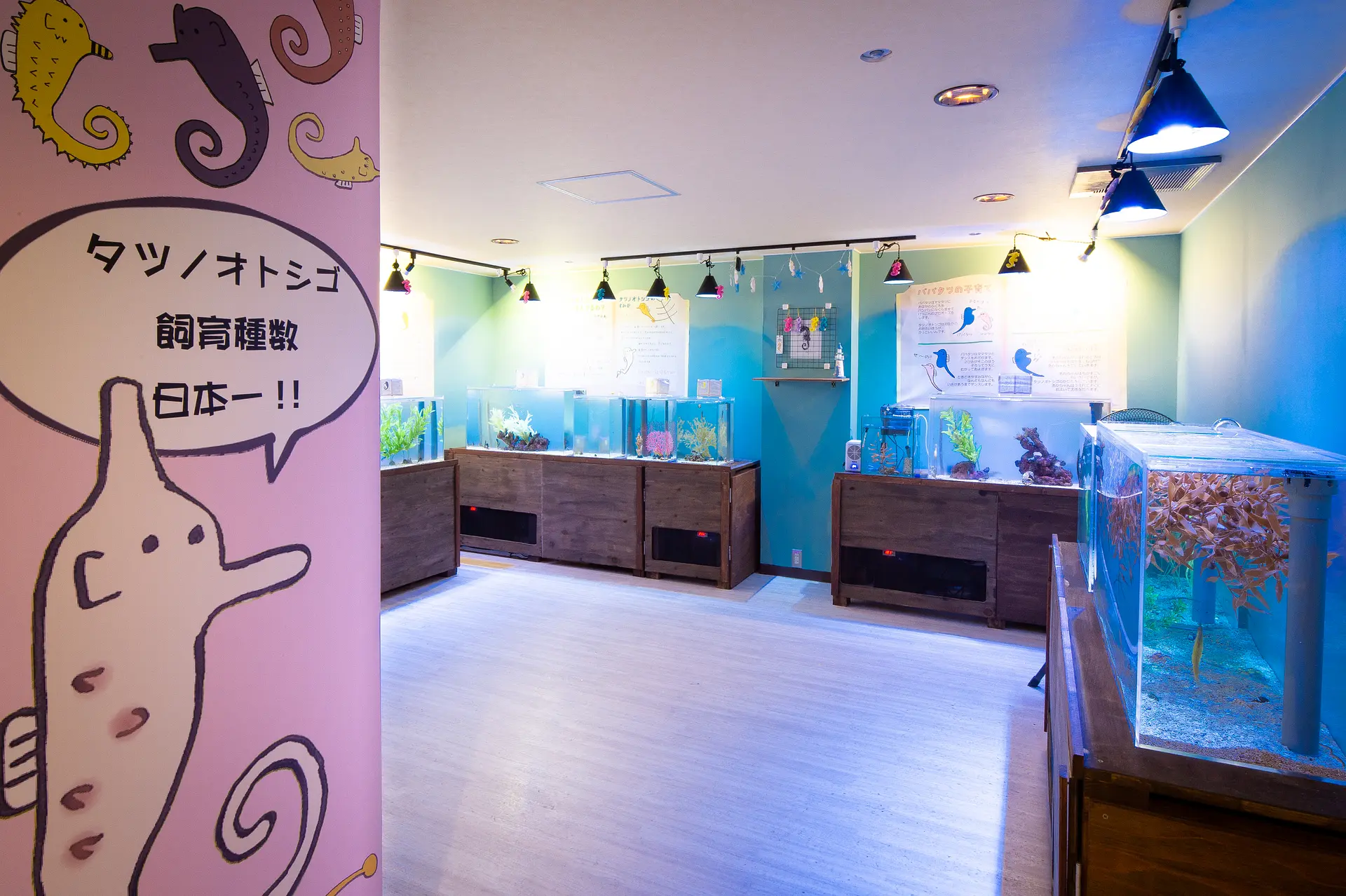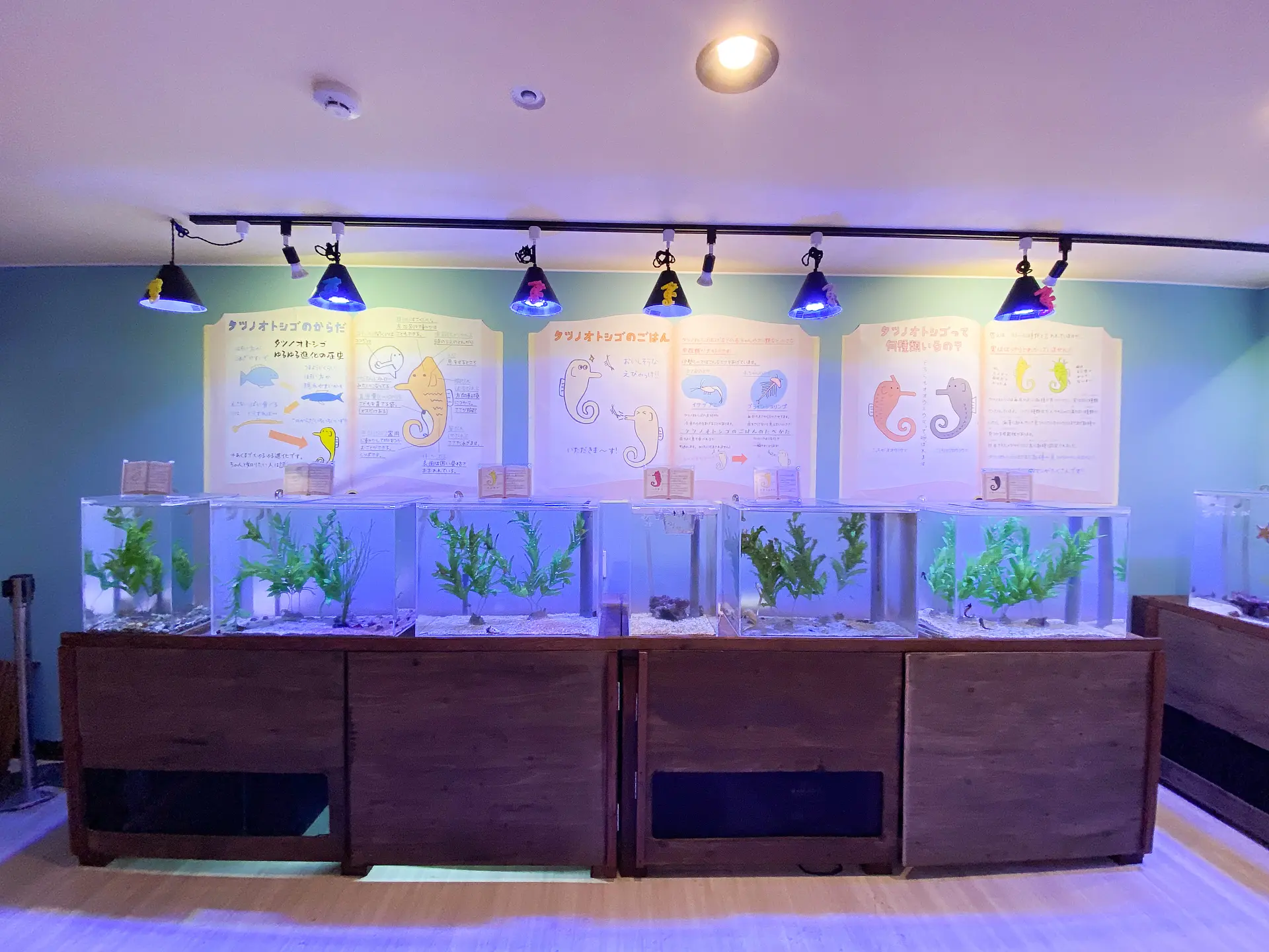 入り口のイラスト入り看板や、タツノオトシゴのまめ知識などすべて飼育員さん手作りのかわいい世界!不思議な生き物タツノオトシゴの秘密に迫ることができます。