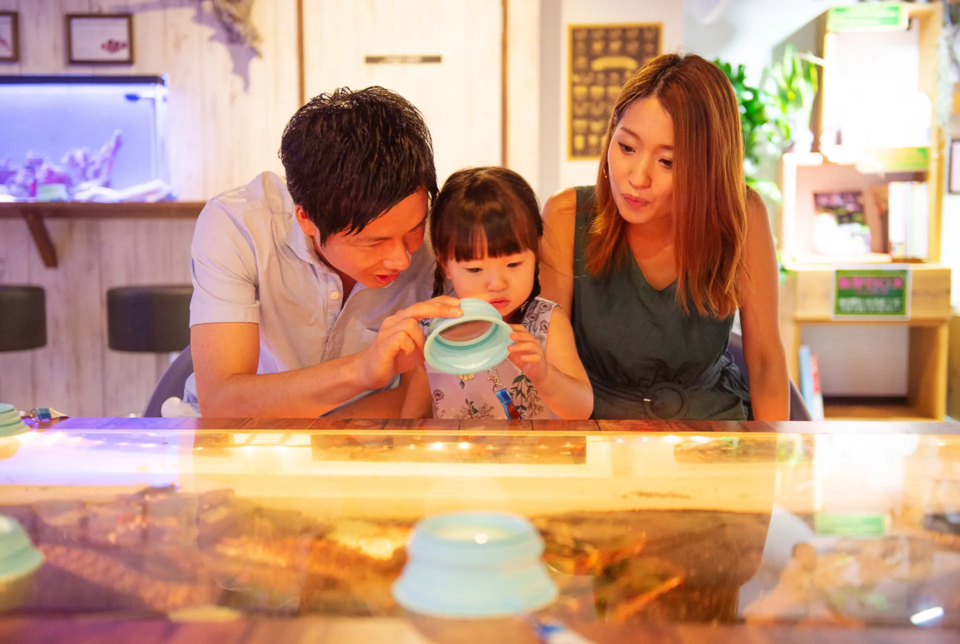 こちらは、鳥の目線でみることができる「バーズアイ水槽」のテーブル席。虫眼鏡などを使って面白く見られるので子どもたちも楽しめますね!海賊船など、世界観に溢れた水槽もまた見どころ!伊勢シーパラダイスはこのように座ってゆっくり見られるところも多く、休憩も兼ねられるので、子連れファミリーにもうれしいポイントです。
