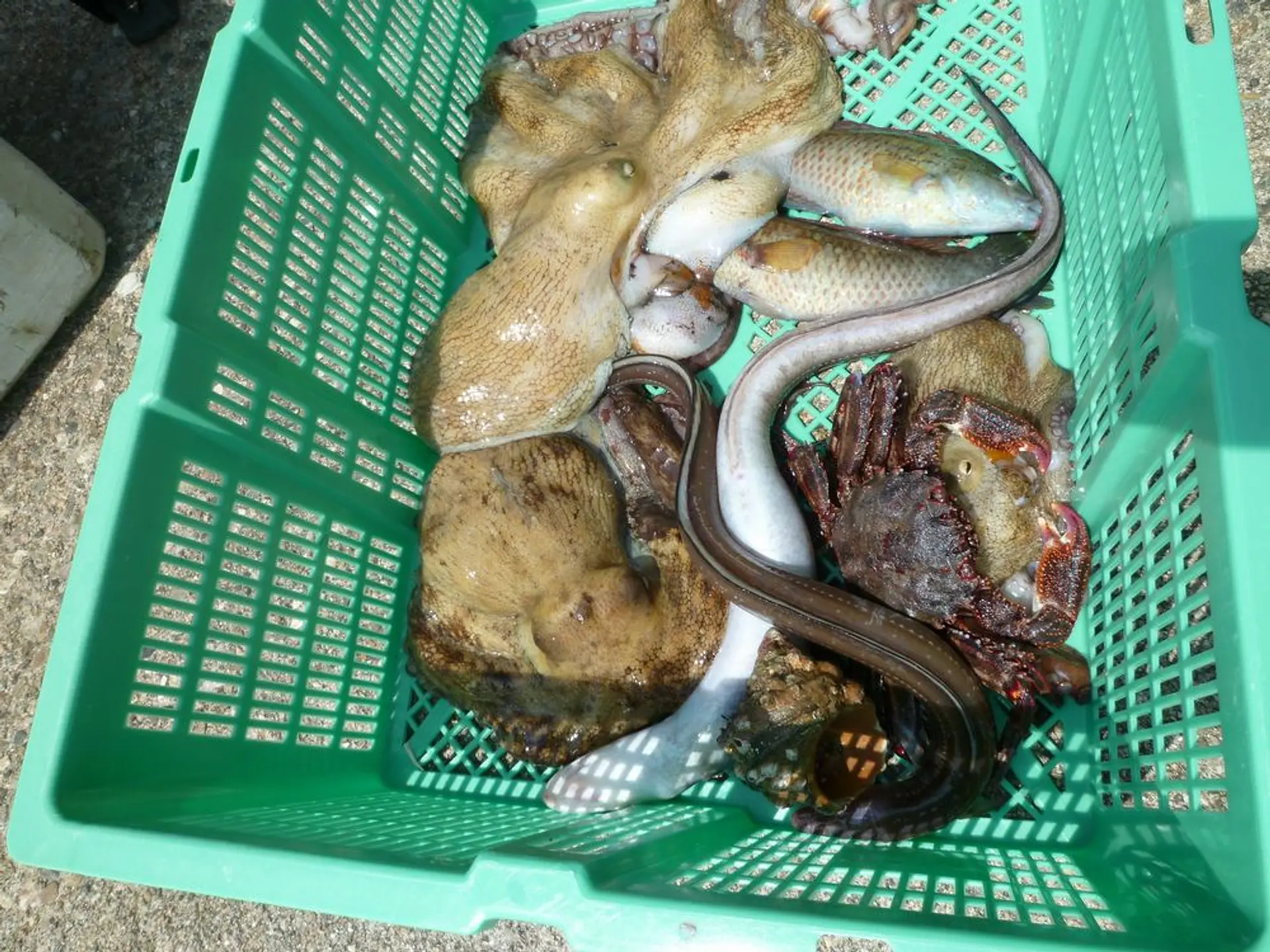 海から上げる瞬間、バチャバチャっと何かが跳ねる音! 篭をのぞくと、アナゴ、タコ、ヤドカリ・・・、いろんなものが入っていて、大漁でした☆