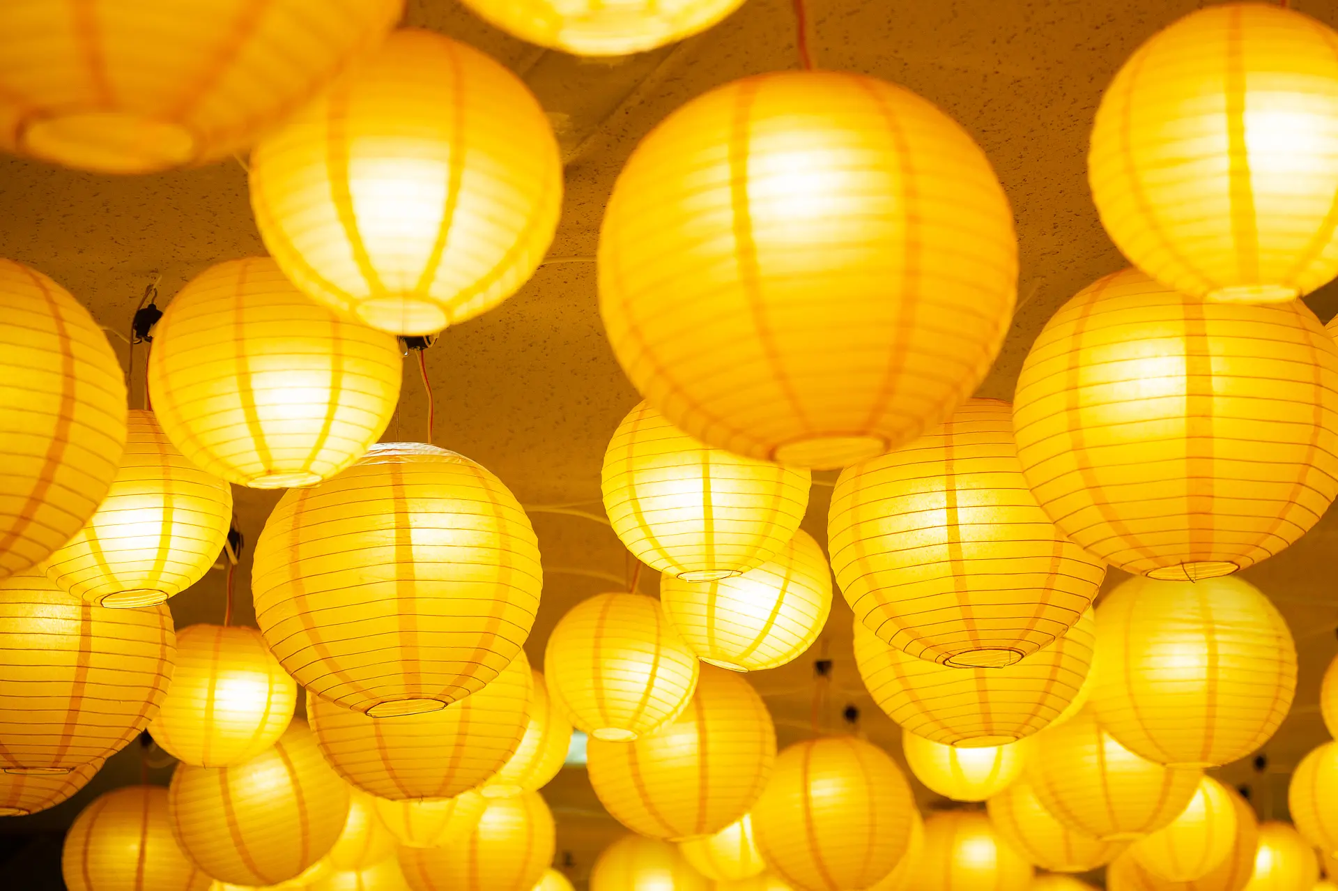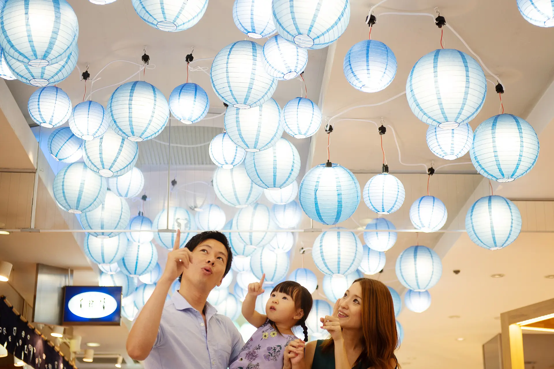 天井一面に張り巡らされたちょうちん。大きなちょうちんと小さなちょうちんが 2 つで 1 組になった「めおとちょうちん」です。