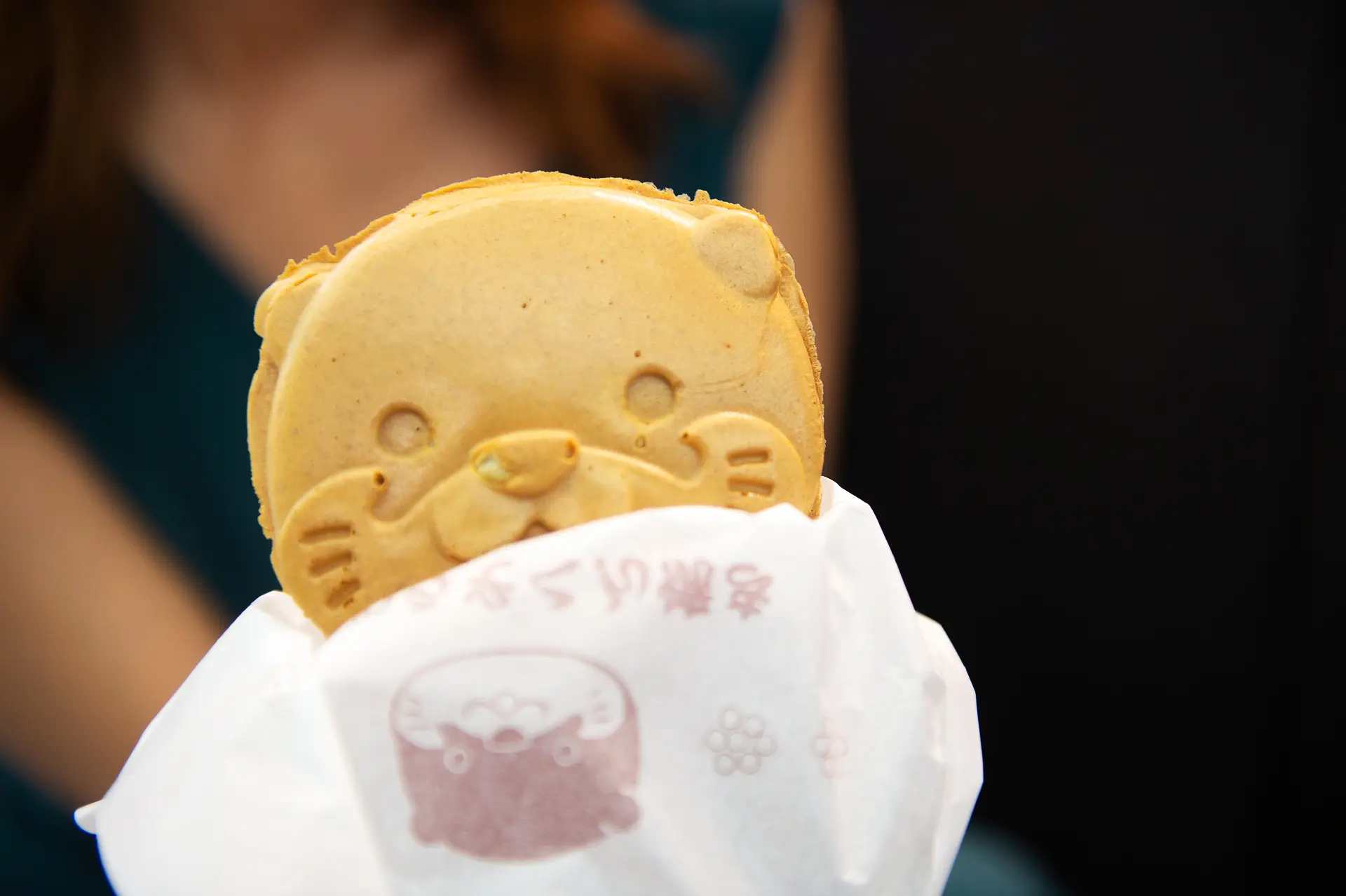 水族館で人気のカワウソの顔をかたどった、愛らしい見た目がSNSでも話題の「カワウソくん焼き」(200円)。