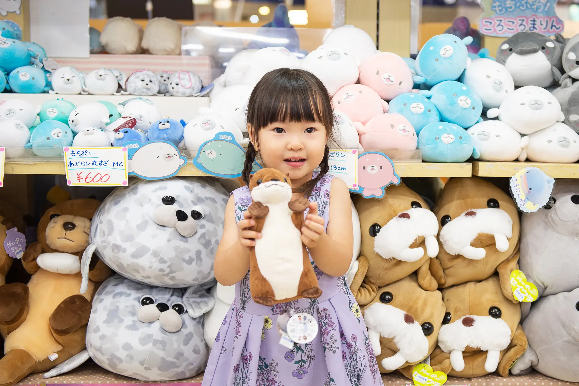 セイウチ、イルカ、アザラシなど…さっき水族館で見た動物たちのかわいいグッズが、ところ狭しと並んでいます!