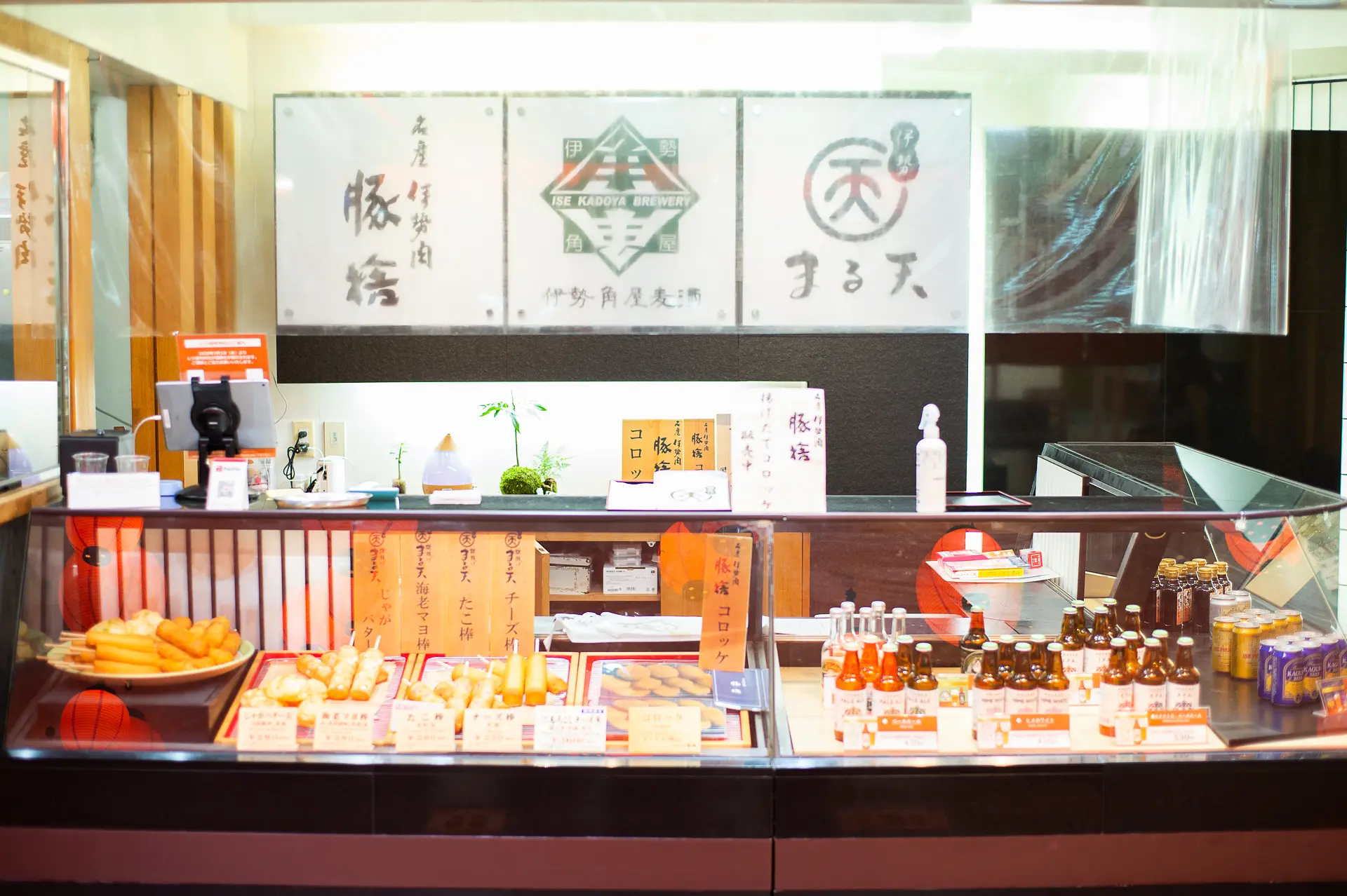 ここでは、伊勢の地ビールやクラフトビールを製造する「伊勢角屋麦酒(いせかどやビール)」、伊勢志摩の魚介を使った揚げ物が名物の「磯揚げまる天」、伊勢の老舗和牛専門店「豚捨(ぶたすて)」の 3 店舗の味が楽しめます。
