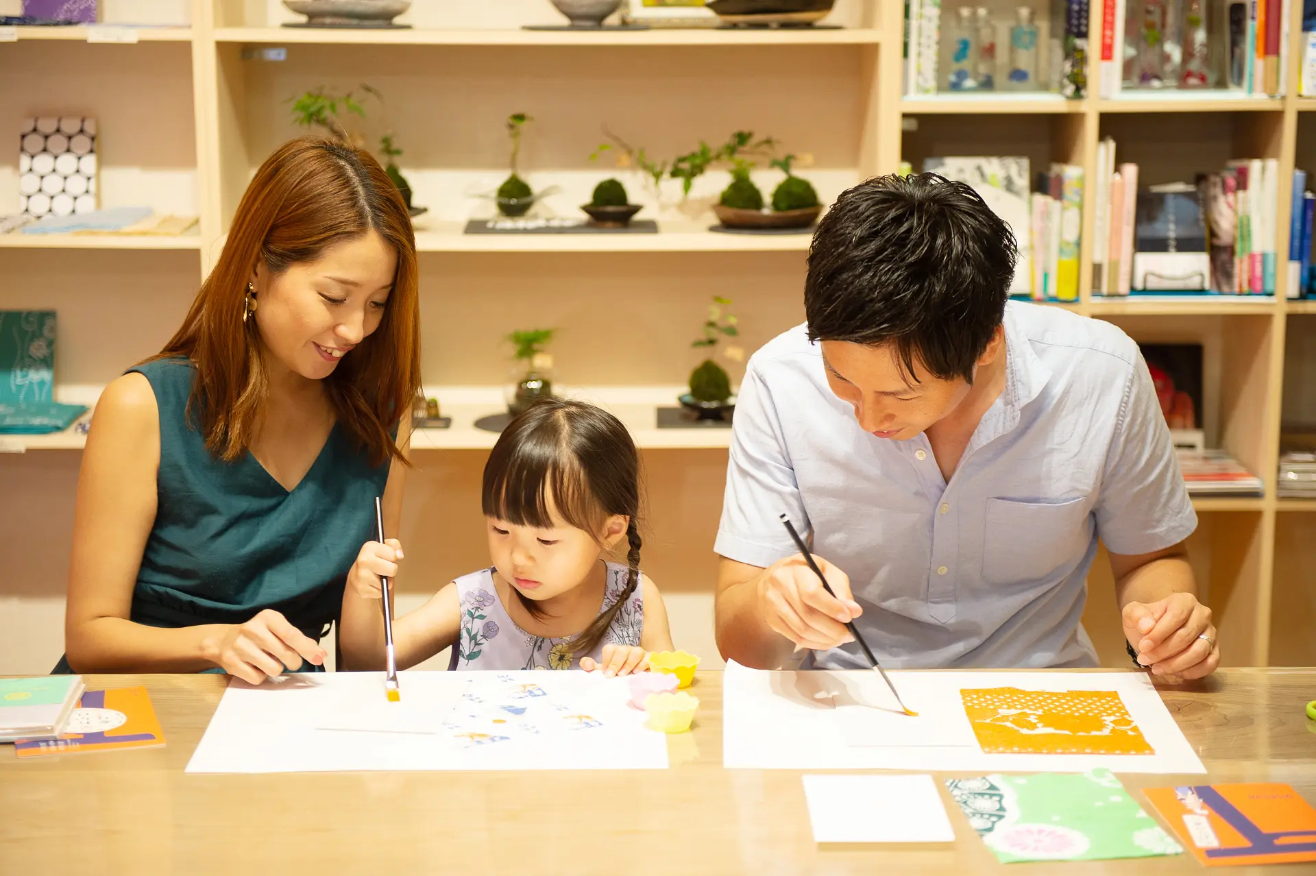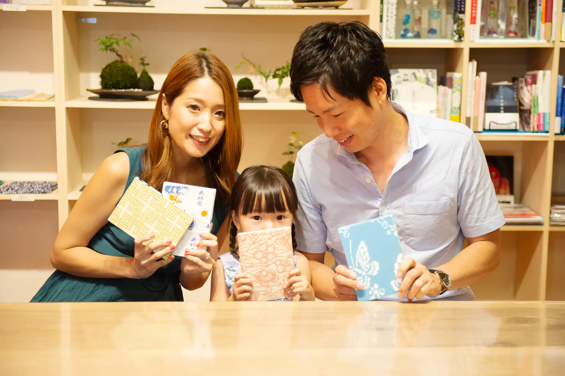 ファミリーはまず、「伊勢木綿でつくる御朱印帳作り体験」に挑戦!