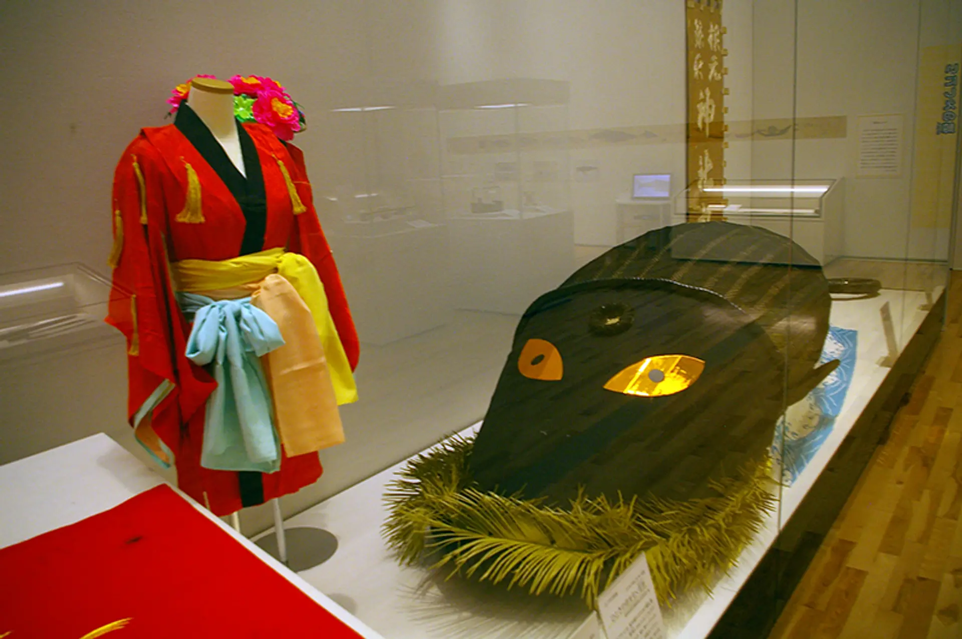 ユネスコ無形文化遺産に登録された「鳥出神社の鯨船行事」で使用される衣装や鯨の張りぼて。