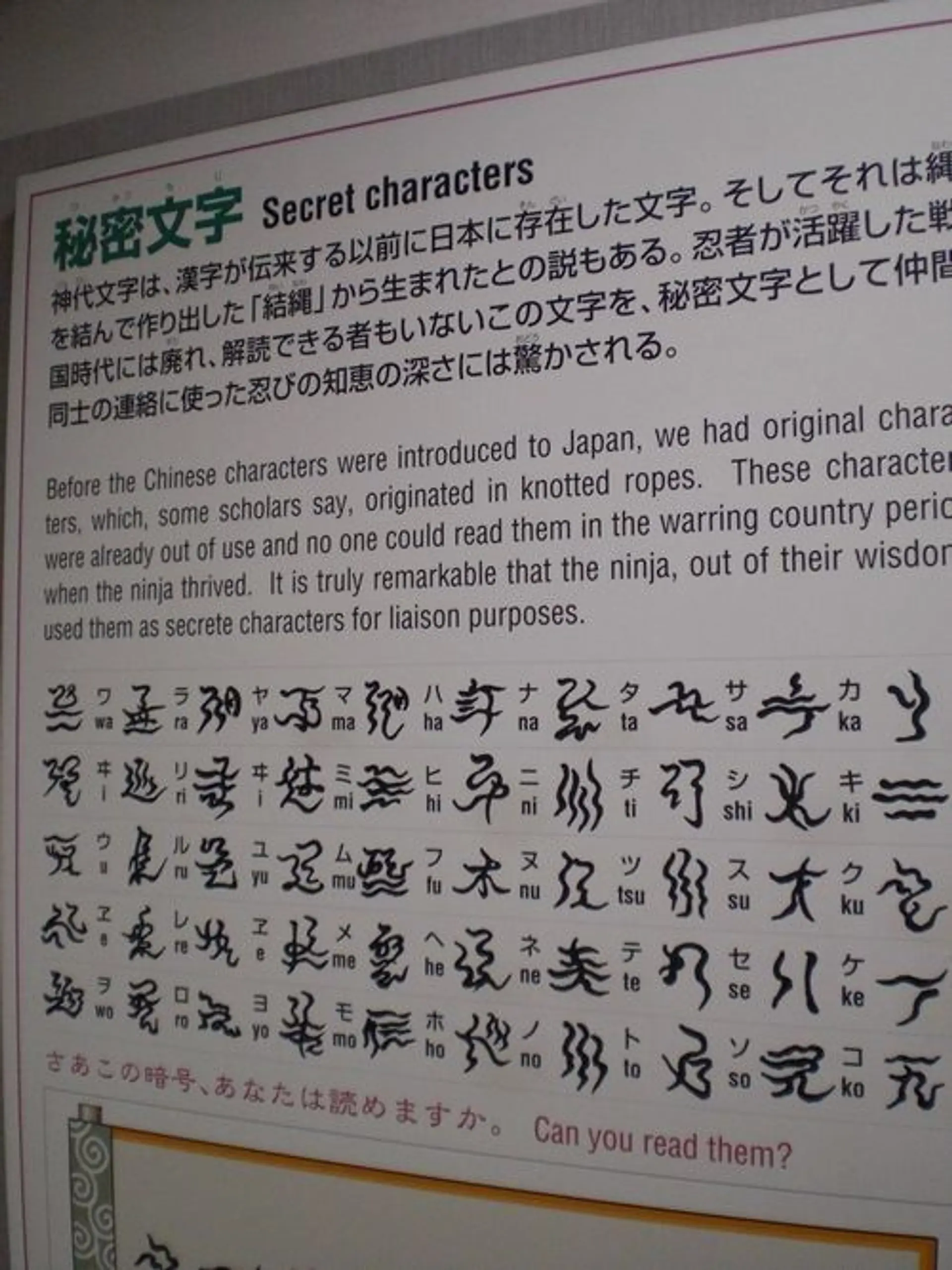 それに、水の見つけ方、方角や時刻、それに天気予報までできたそう。医学、薬学、心理学、天文学にも秀で、難解な忍者文字や米粒を使った暗号なども記憶していた忍者って、ほんとにスゴイです。