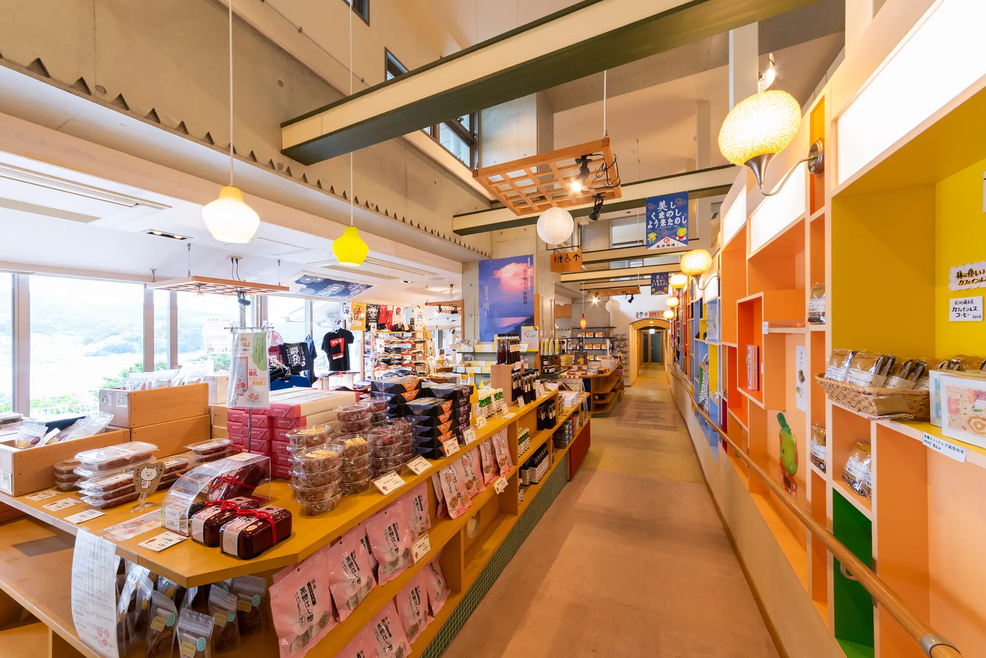 テラス席で熊野灘を眺めながら食事ができる「リストランテ マリーナ」。ご当地スイーツ「にいひめソフトクリーム」などが楽しめる「テイクアウトコーナー」。地元特産品が盛りだくさんの「土産物コーナー」などがあり、熊野を丸ごと体感できるアイテムがいっぱい!観光情報を発信する大型モニターや、 夏の熊野大花火に使用される打ち上げ花火玉の模型なども設置されています。