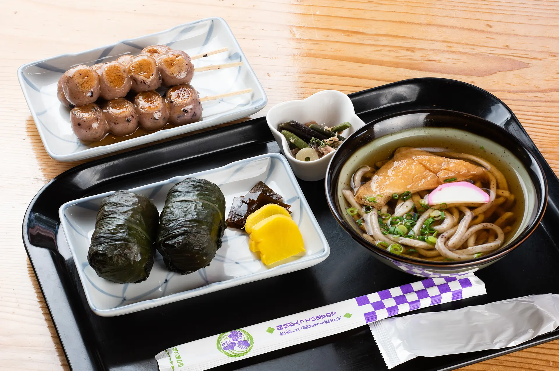 セットのめはり寿司は、好みによりさんま寿司や古代米おにぎりに変更できます。写真上は「古代米みたらし団子」(1本100円/税込)。注文してから焼いてくれるので、常に熱々のままで食べられます。どちらも稲作文化の原点ともいえるいざなみ米(黒米)の風味や、独特のもっちりとした食感を楽しめますよ。