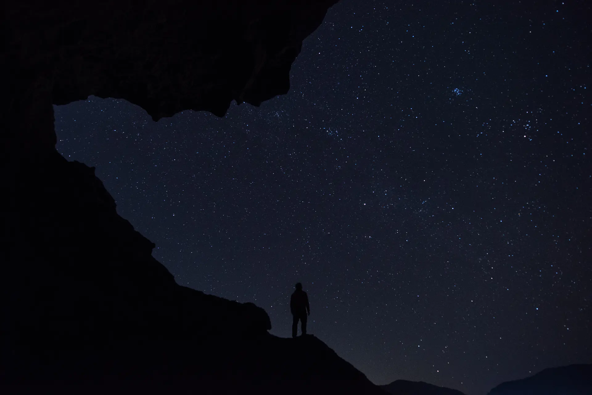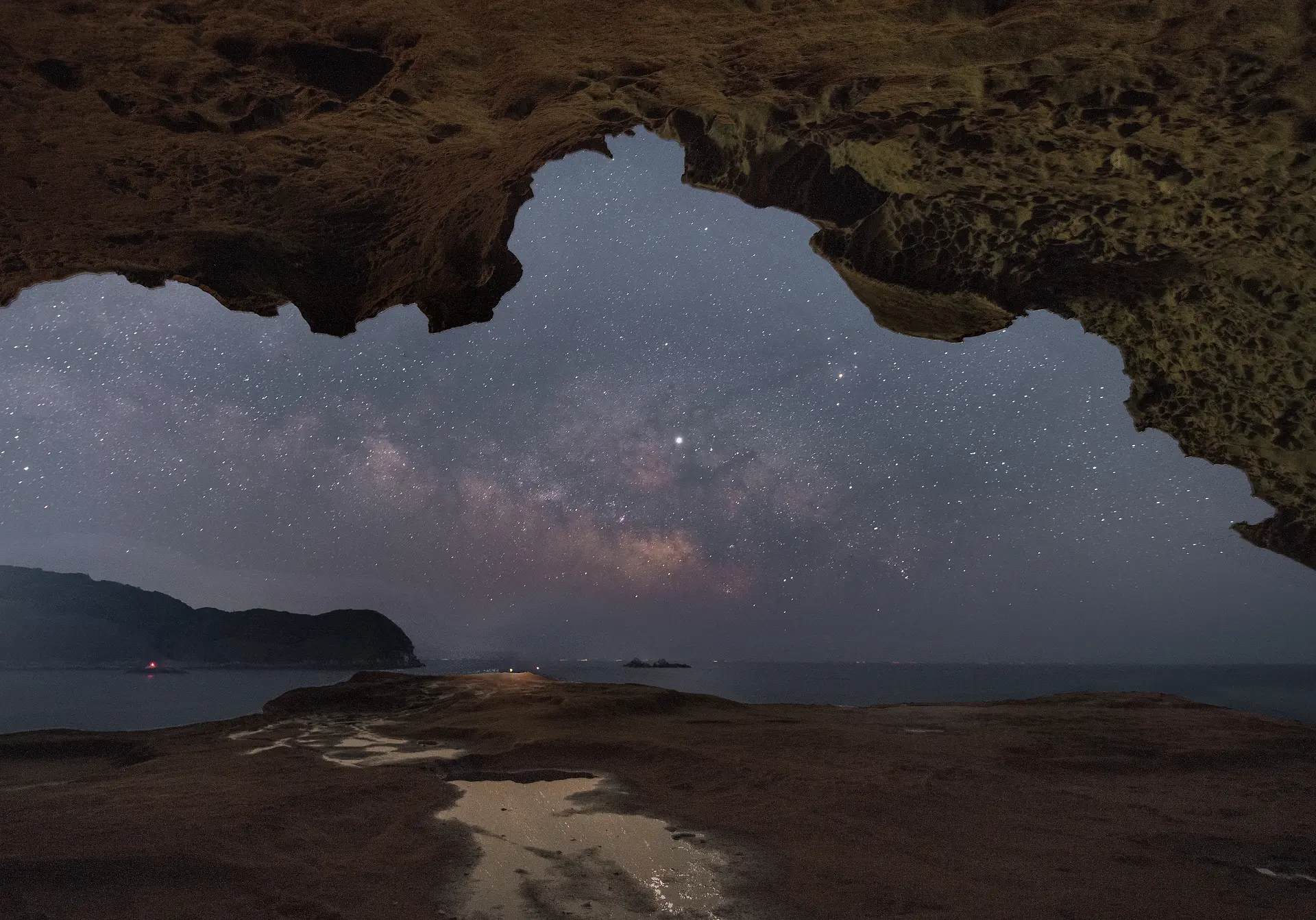 水たまりができやすいので、水面に風景が映り込むリフレクション(反射)を利用した撮影も可能です。垂れ下がるように張り出している岩の先端の形状と、一面に広がる星空が独特のシルエットを生み出しています。