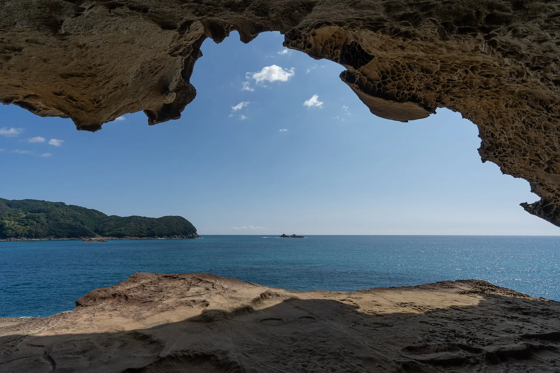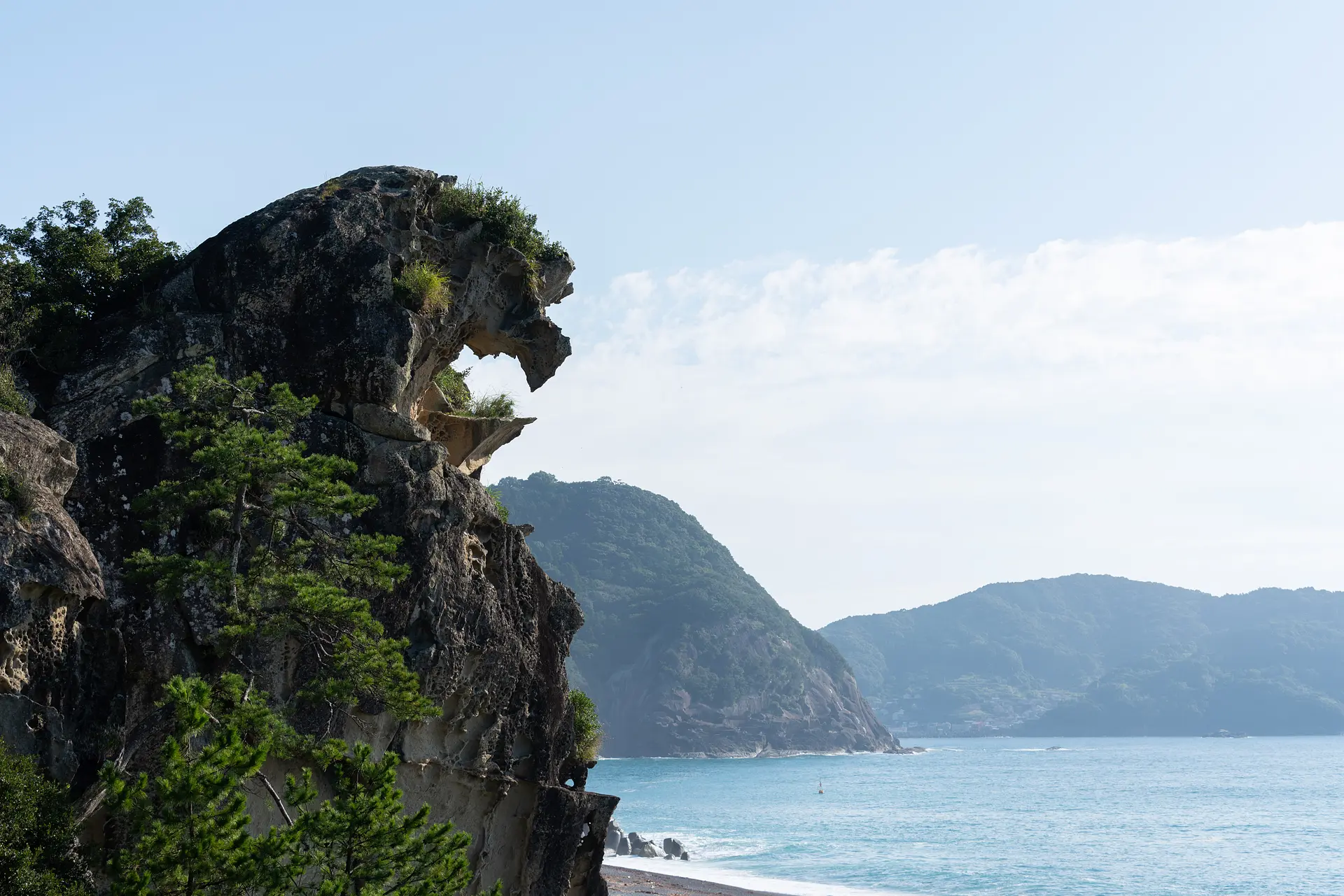 「神が造った彫刻」としか言いようのない特徴のある形状の「獅子岩」。高さ25m、周囲約210m。大きな獅子が、広い海に向かって咆哮しているような姿は、一度見れば忘れられないぐらいのインパクトがあります。