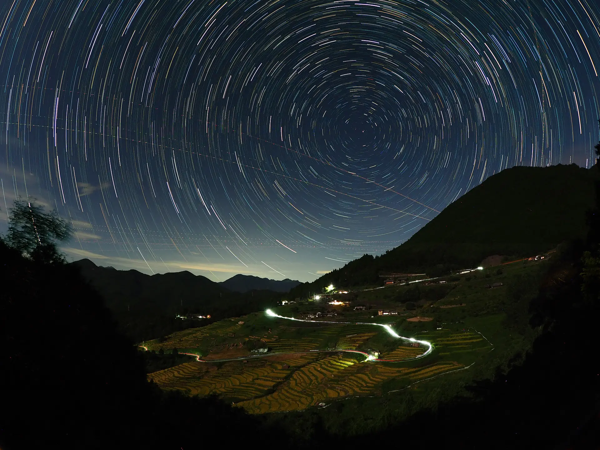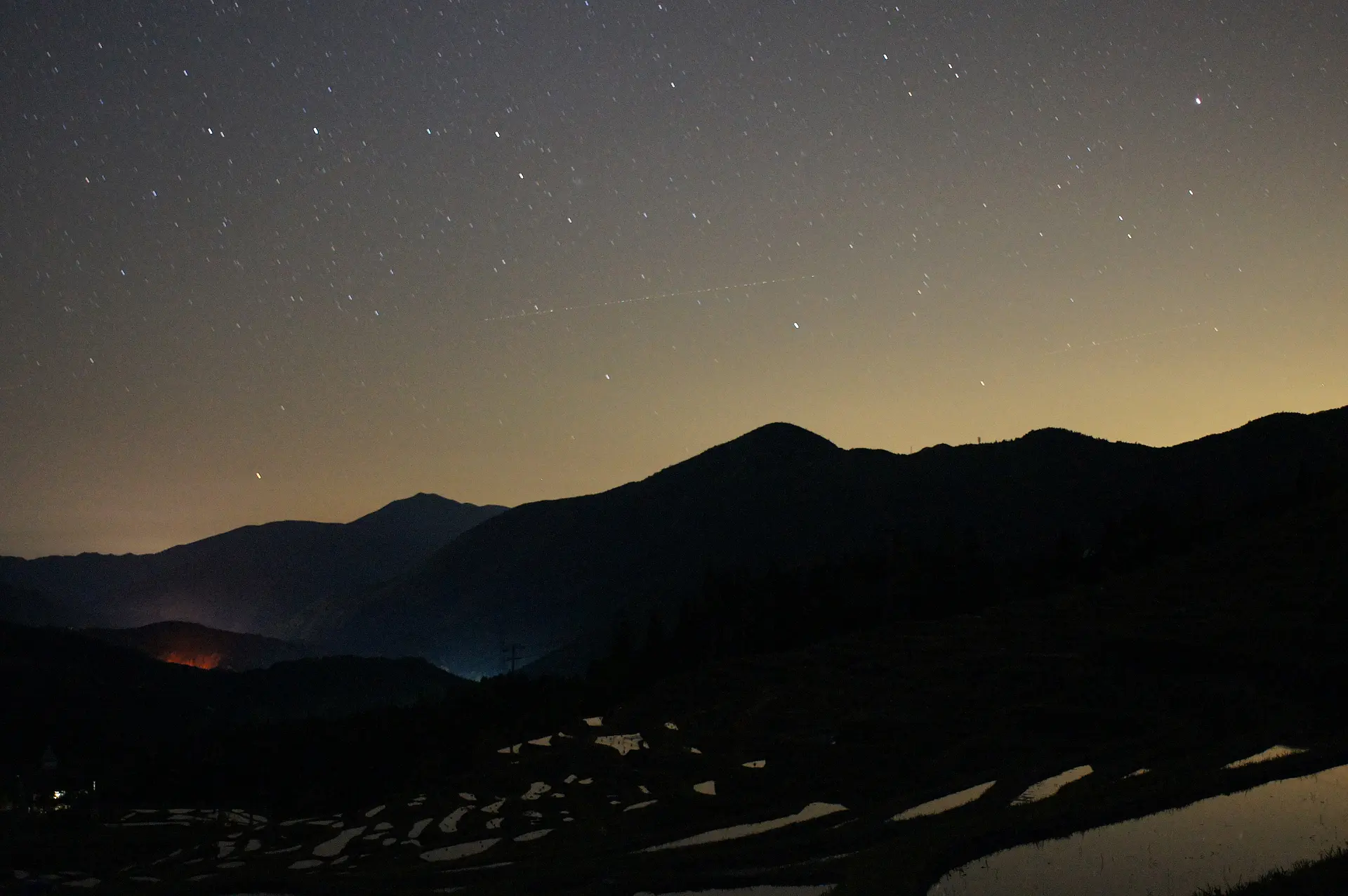 田に水が張られている時期は、星や月明かりがリフレクション(反射)するシーンを狙うこともできます。ただ、夜は地上部分がかなり暗くなるので、棚田の光景を捉えるのは、少々テクニックが必要かも。
