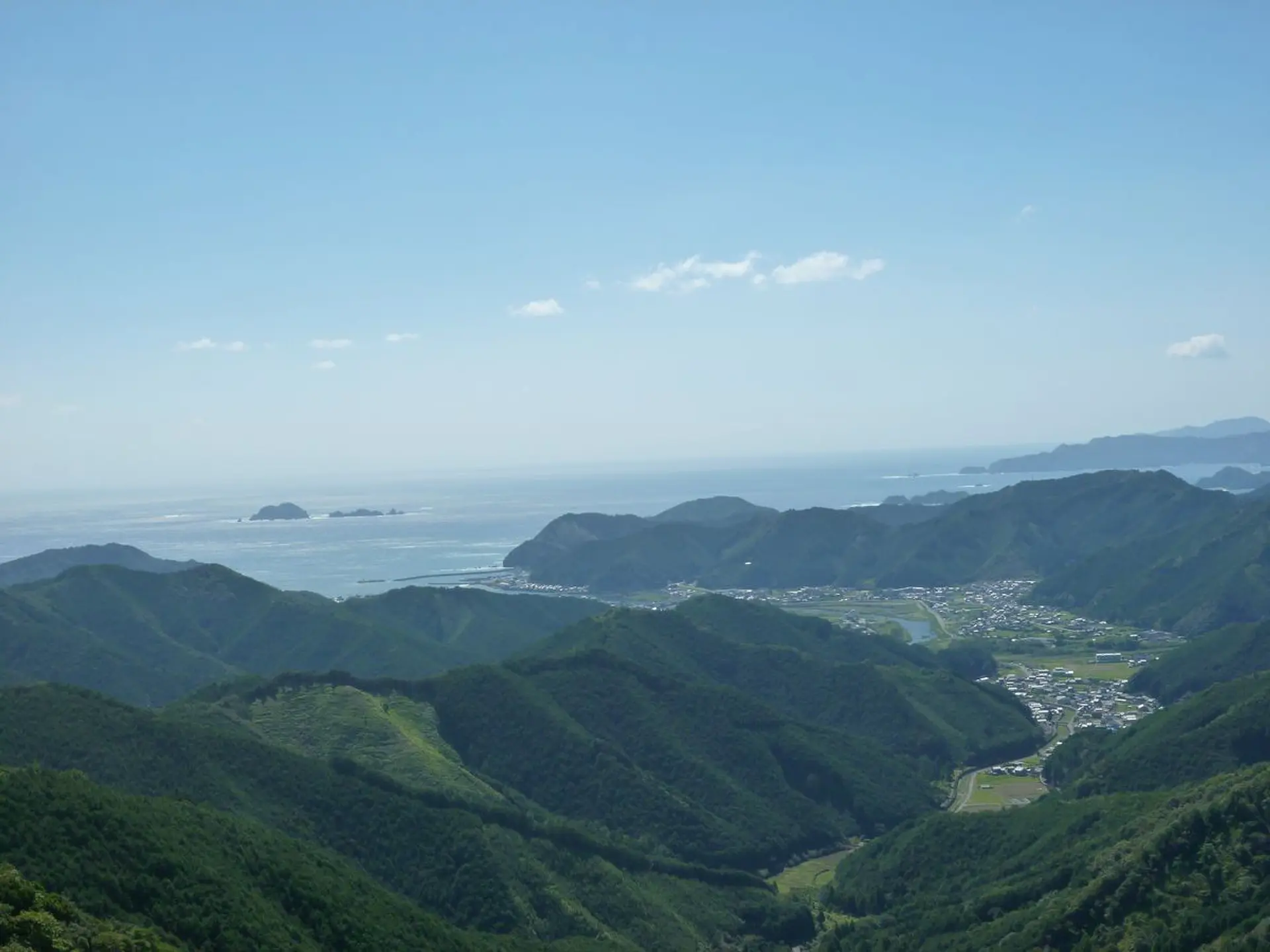 太陽の光を浴びてきらきらと輝く熊野灘、紀北町の町並みや田畑を望む景色は最高でした。遠くには八鬼山も見えました。