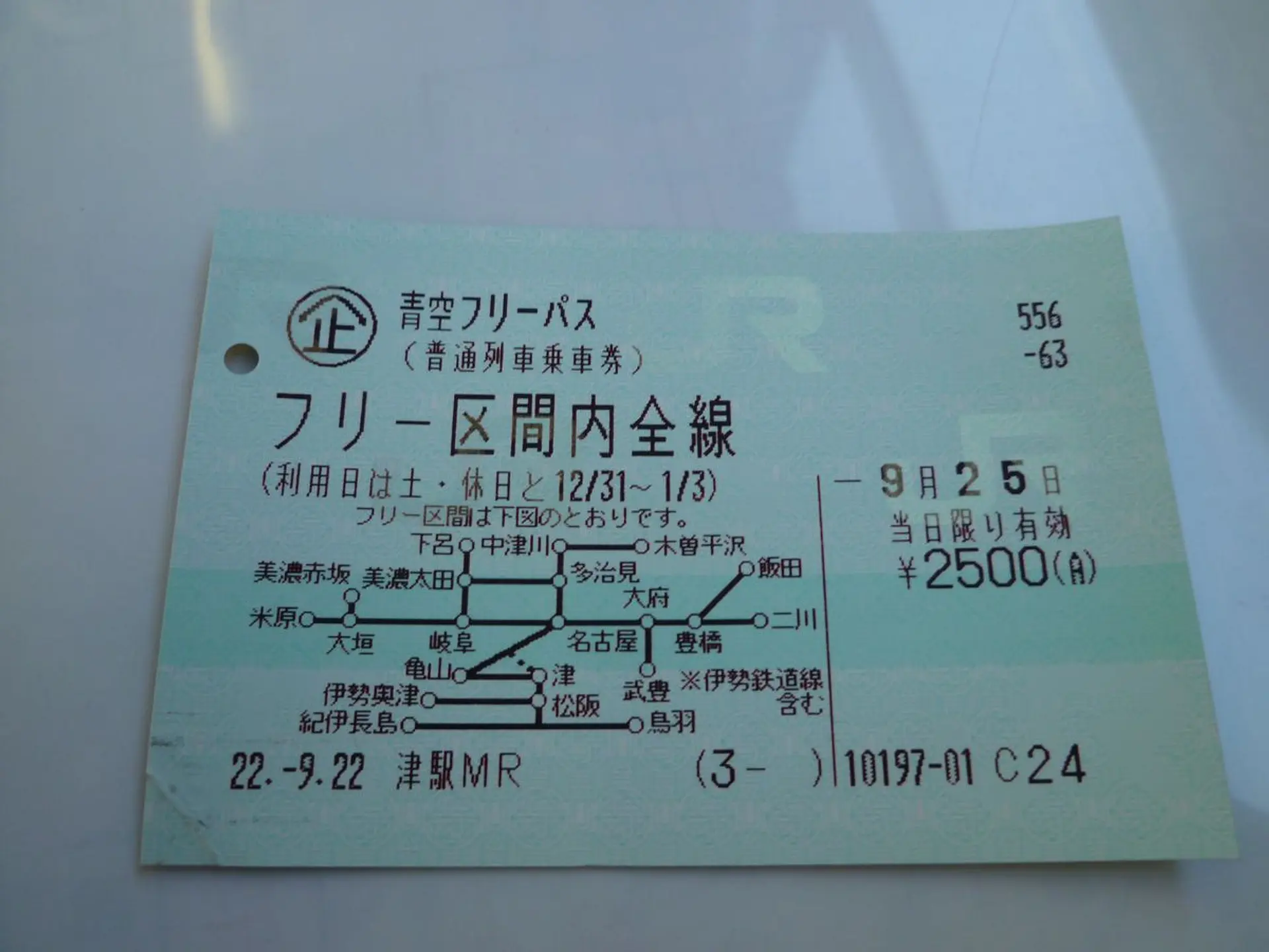 青空フリーパス:土曜・休日・年末年始に、フリー区間内の快速・普通列車普通車自由席に乗り降り自由の1日フリーパス。名古屋はもちろん、米原、下呂、飯田、二川から乗っても大人2,500円(子供1,250円)。