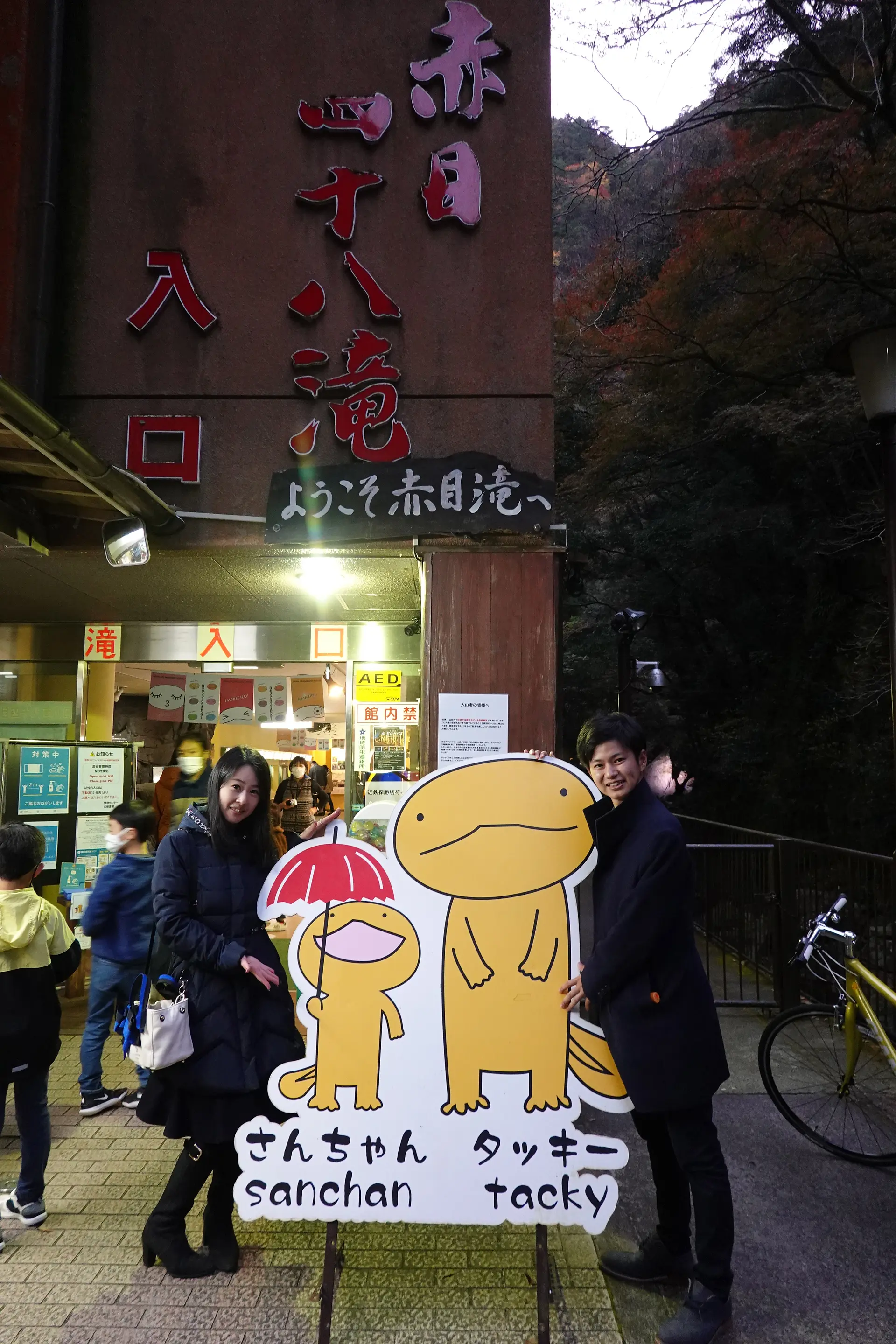 「日本サンショウウオセンター」という施設があり、そのキャラクター「タッキー」と「さんちゃん」がかわいすぎたので、一緒にパチリ。