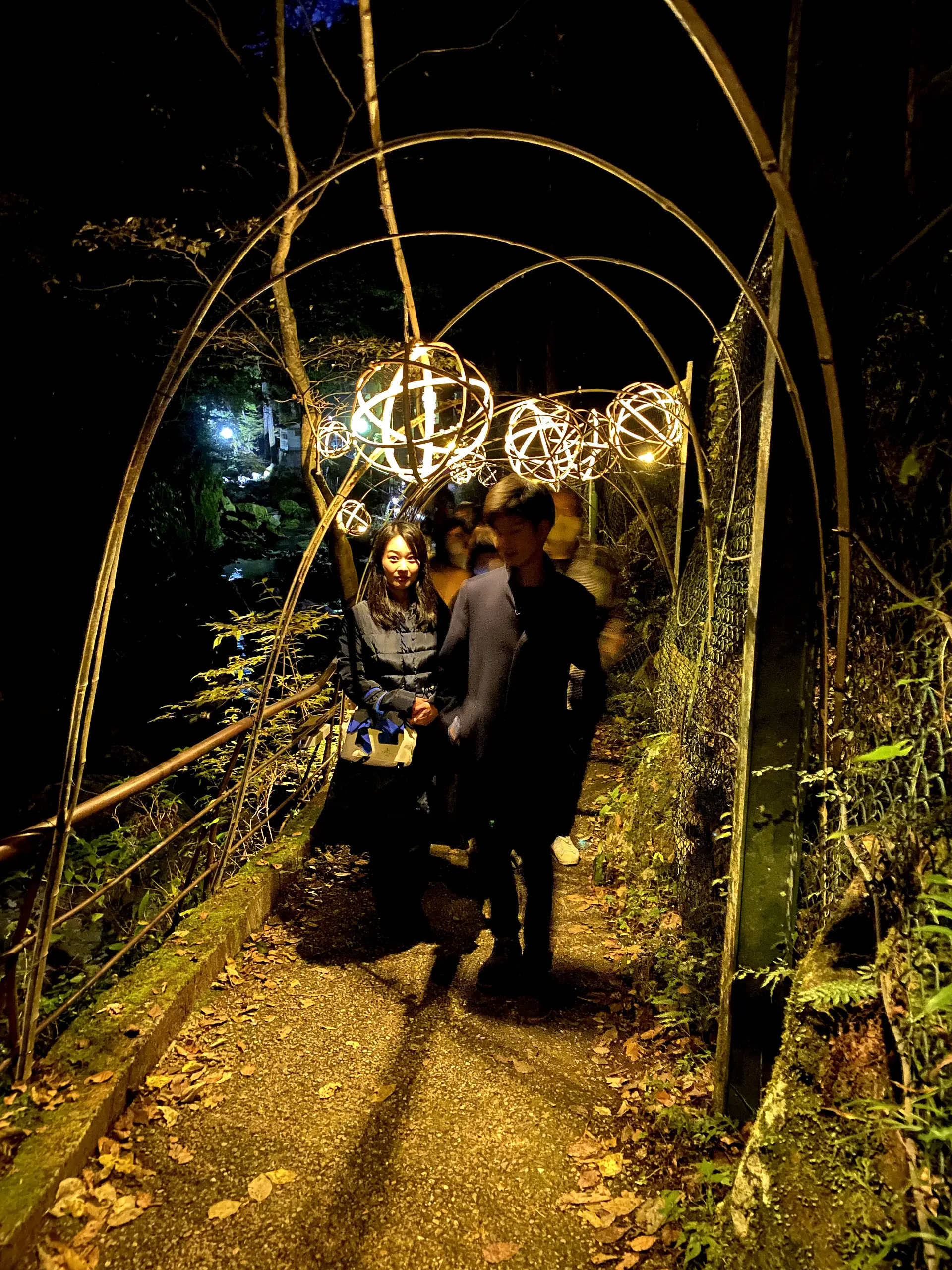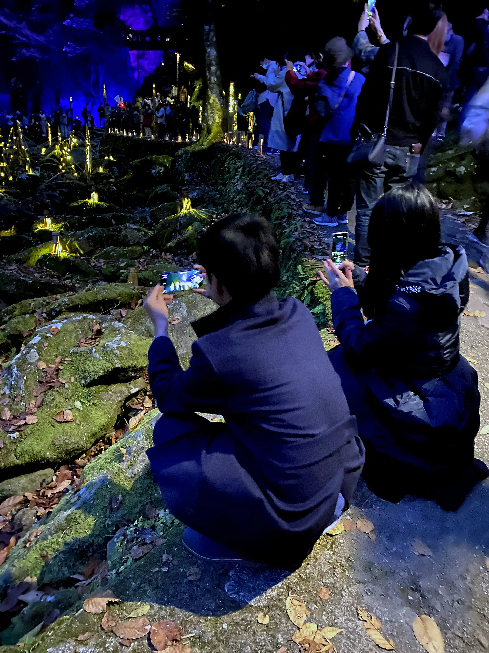 そして、いよいよ入山! ライトアップされた場所までの遊歩道にも心憎い「光の演出」。