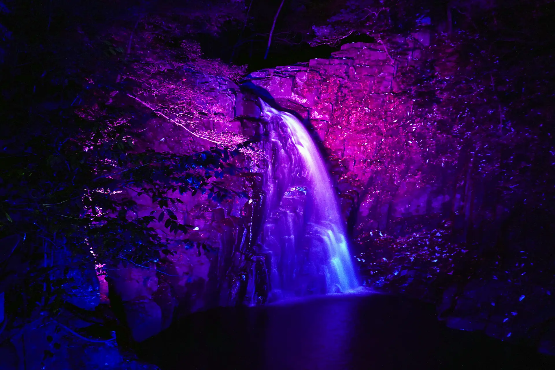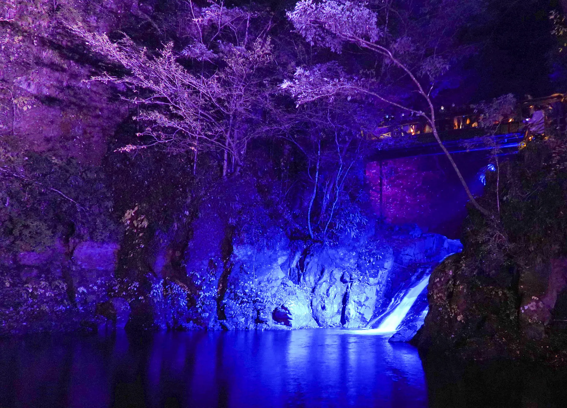 岩や樹木、滝壺が美しく調和した「霊蛇滝(れいじゃだき)」も見どころ。このライトアップは息をのむほどの美しさです!