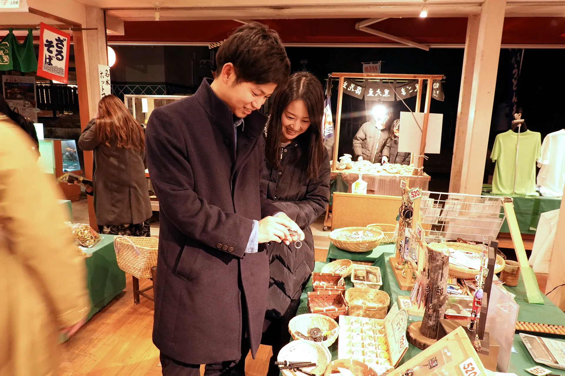 名張周辺の特産品が幅広くそろっています。旅の記念になる、二人おそろいの小物をチョイス。