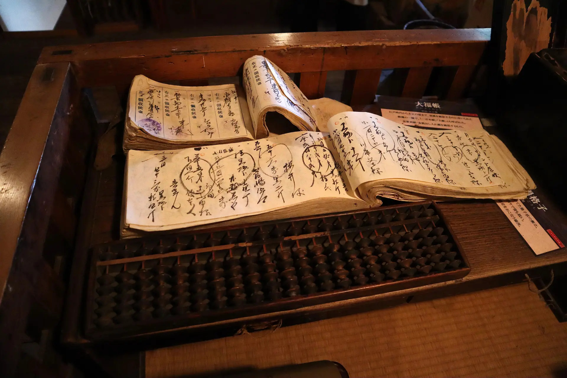 二軒茶屋餅の2階部分は、かつて宿としても営業していたので「角屋民具館」には、当時使用した食器・寝具などが展示されていました。写真に写っているのは大福帳という商業帳簿です。