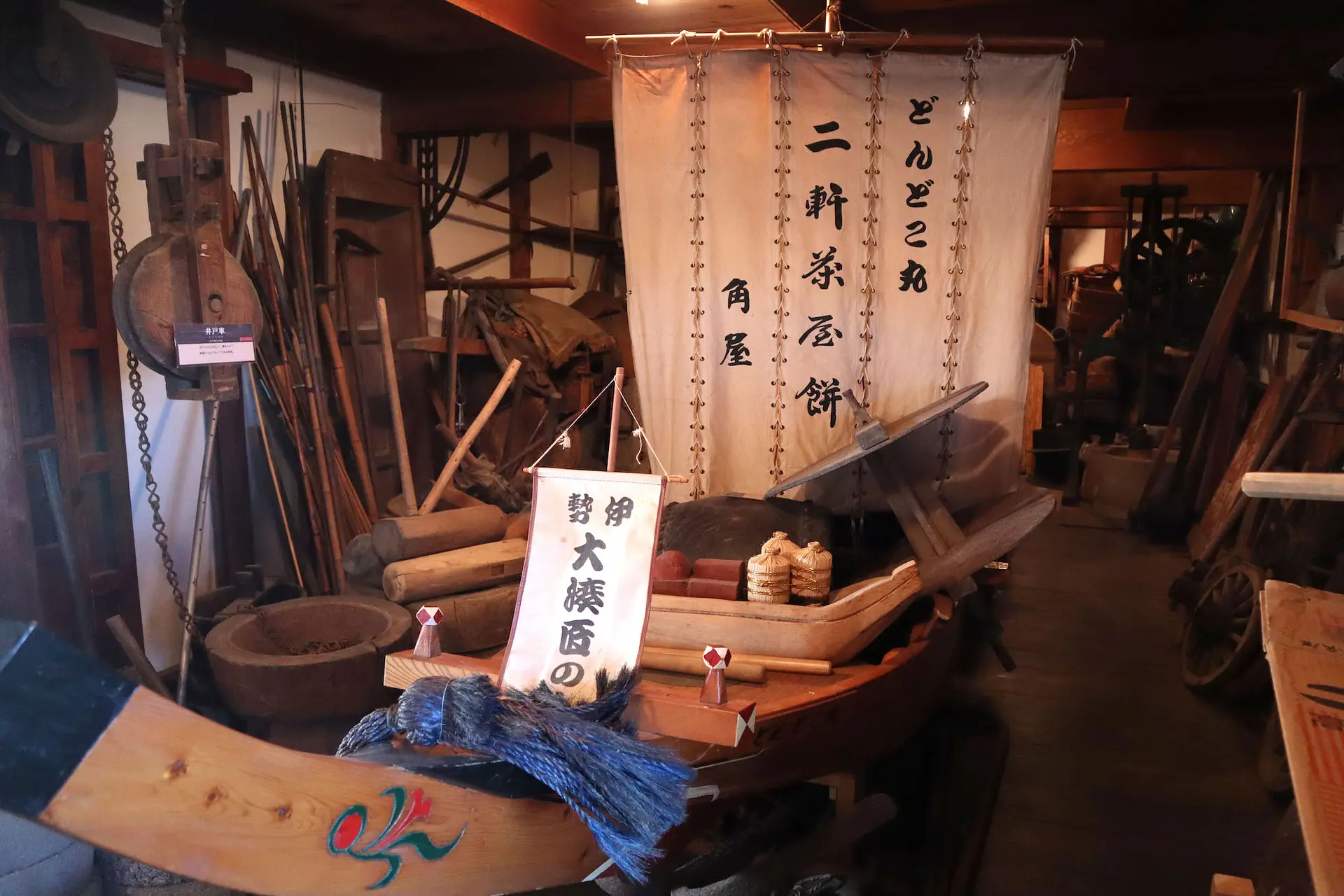 二軒茶屋餅を出てすぐ近く、勢田川沿いにある歴史漂う古い木造の建物(左)は、伊勢のまちかど博物館にも選ばれている「角屋民具館」です。
