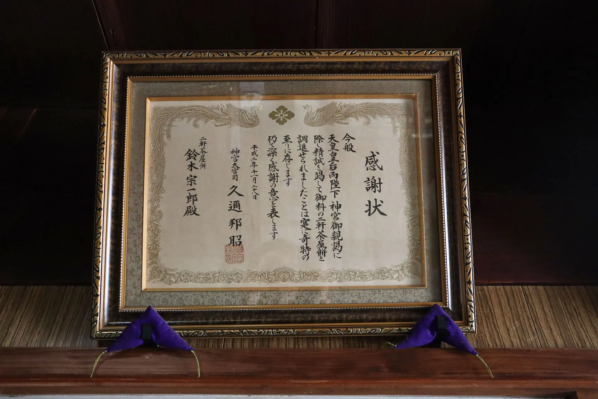 店内を見渡すと、伊勢神宮からの感謝状が掲げられていました。