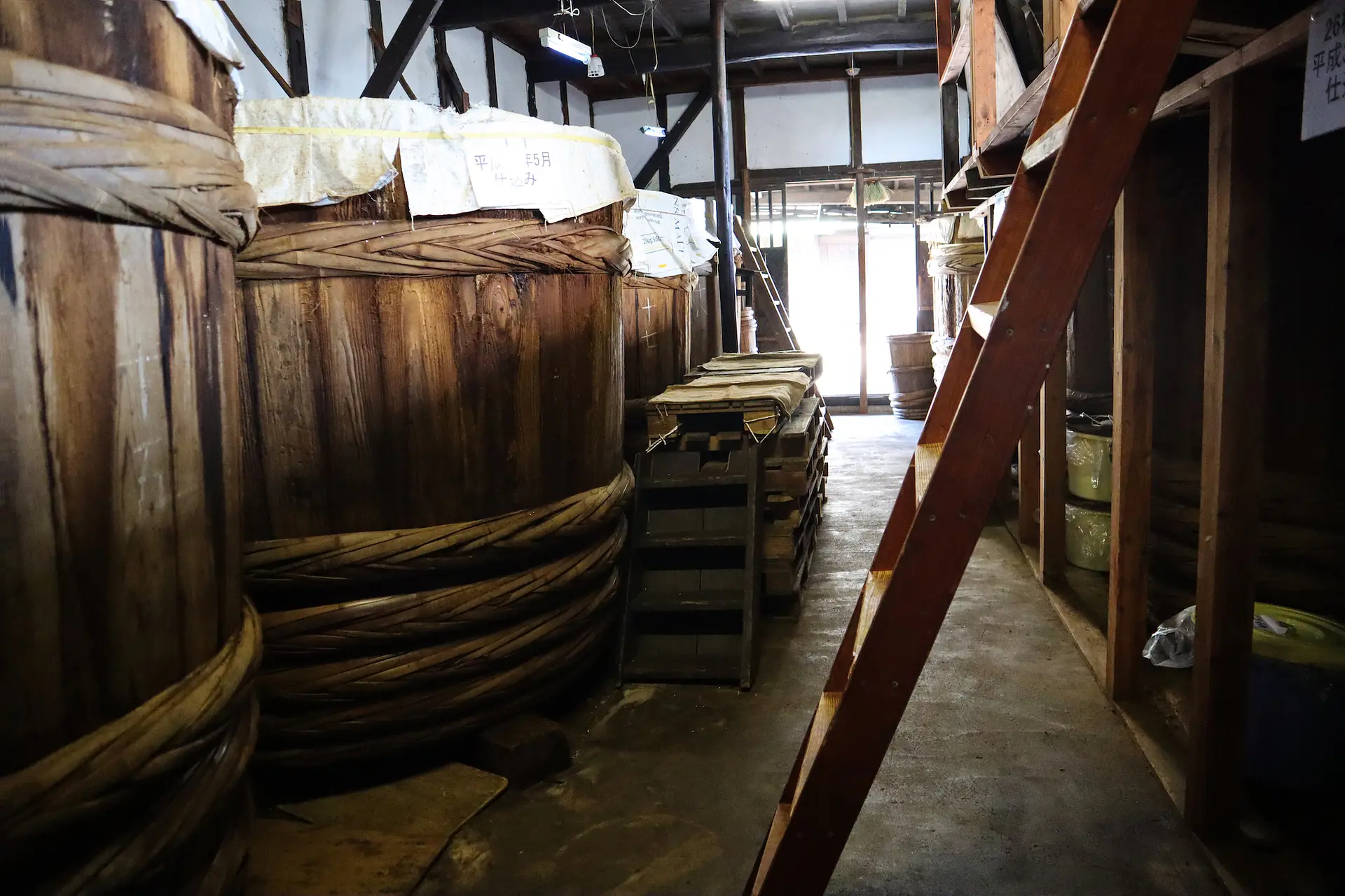 蔵の中は、味噌と醤油の良い香りが漂っていて、百年前から使ってきた醸造用の巨大な樽に歴史の重みを感じます。