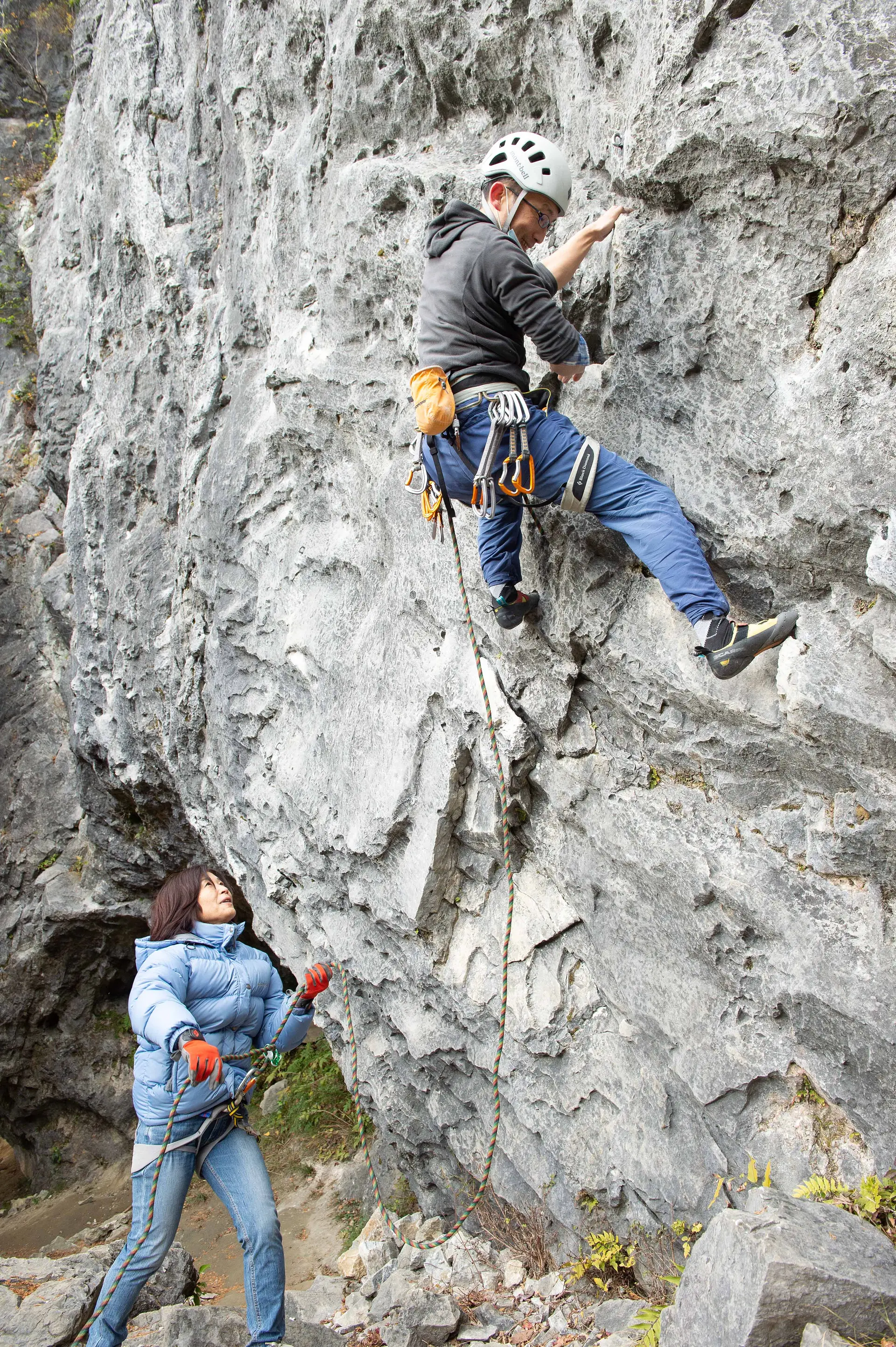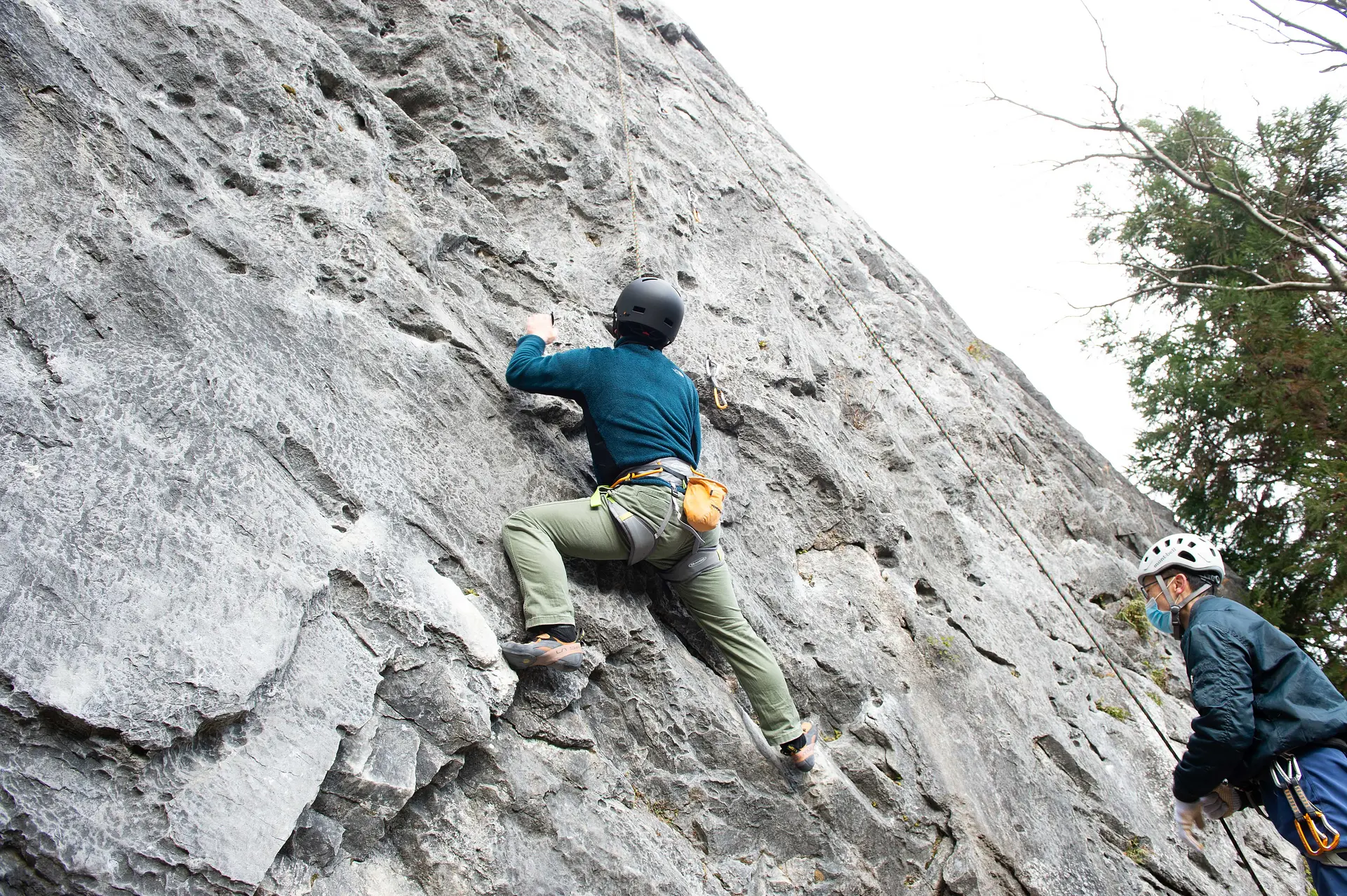 ロープクライミングは、クライマー(登る人)と同じロープで体を繋いだビレイヤー(下でロープを確保する人)がペアになって、はじめて登ることができるスポーツ。
