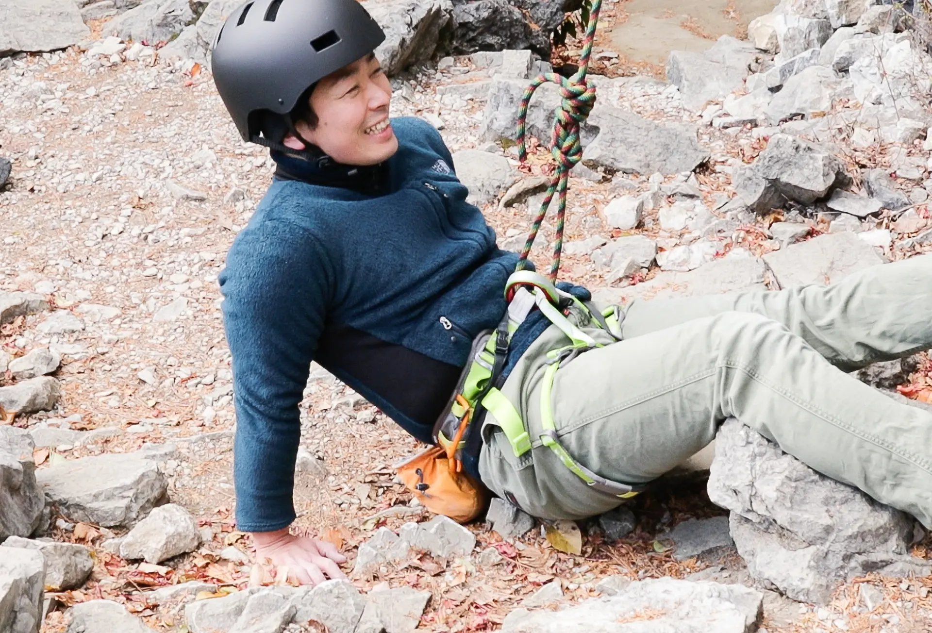 降りる時は、ビレイヤーがロープをコントロールして下まで降ろしてくれるので、岩を歩くように、ゆっくりと下を確認しながら降りていきます。