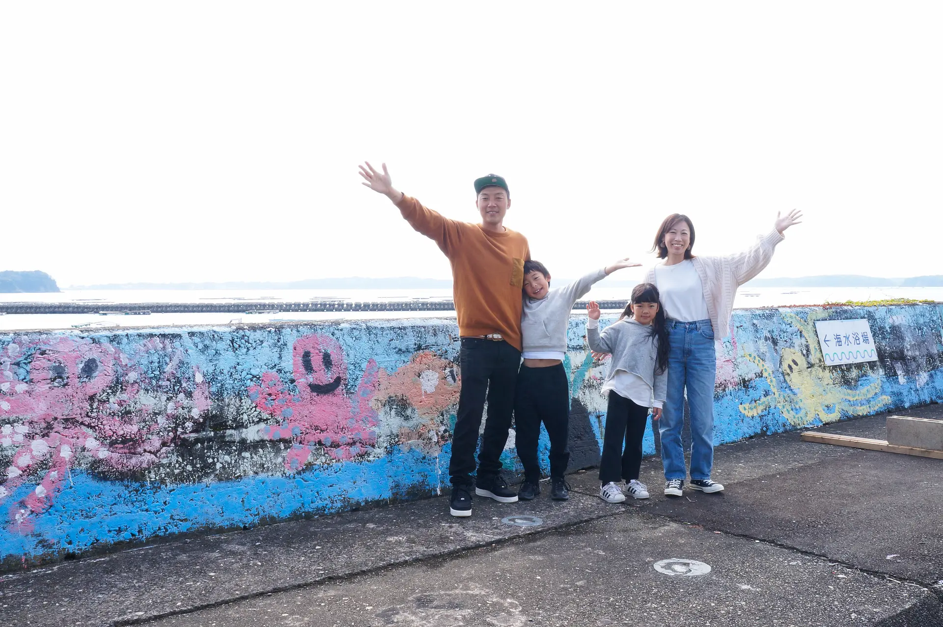 波静かな入り江の畔蛸(あだこ)町に到着した時に、まず目を引くのが堤防に描かれている蛸の絵。地元の小学生がペンキで描いた絵なんだそうです。
